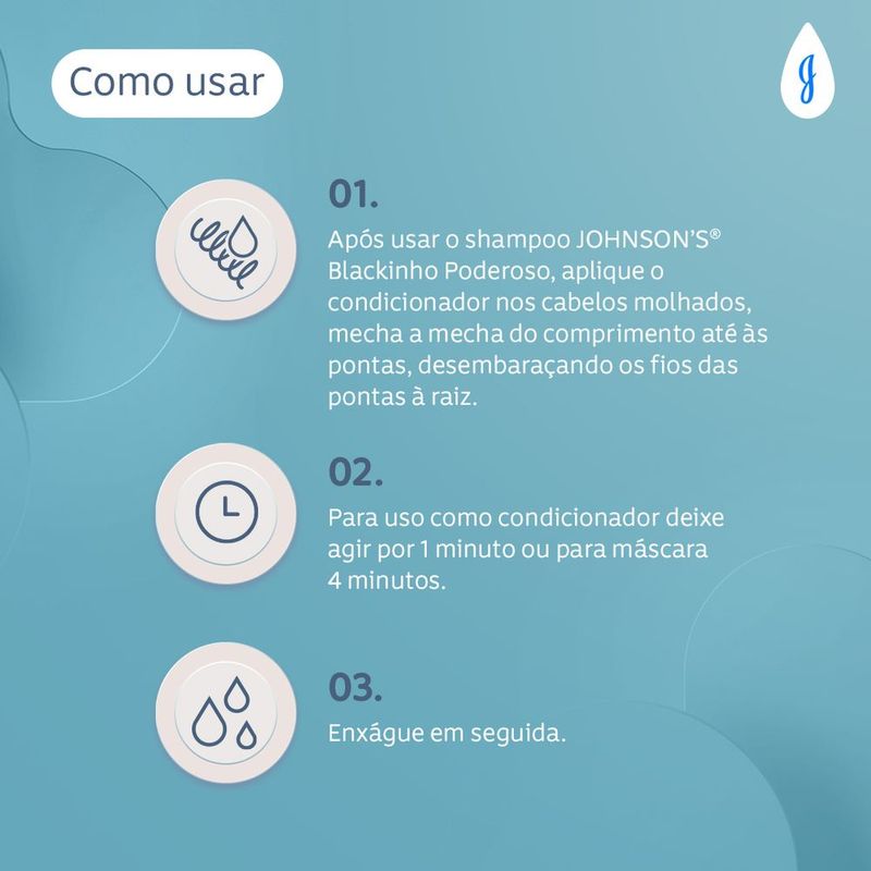 Condicionador Infantil Johnson Baby Blackinho Poderoso 380gO Condicionador Infantil Johnson Kids Blackinho Poderoso foi desenvolvido para deixar os cabelos crespos das crianças hidratados, macios, brilhantes, perfumados e saudáveis. Sua fórmula enriquecida com óleo de coco ajuda a desembaraçar os fios, deixando os cachos definidos e naturais o dia todo. Com ph fisiológico, é hipoalergênico e livre de corantes, parabenos, sulfatos e ftalatos.