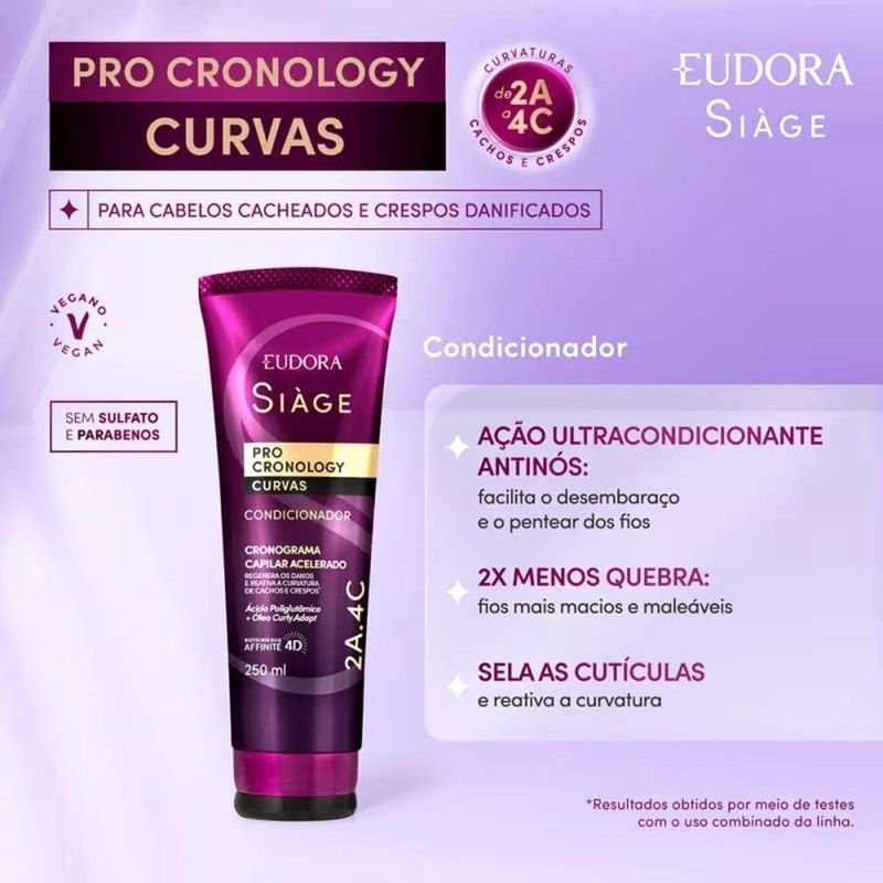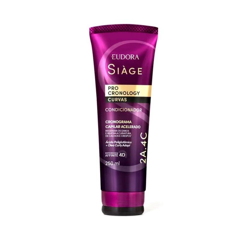 Condicionador Siàge Pro Cronology Curvas 250mlO Condicionador Siàge Pro Cronology Curvas possui fórmula ultracondicionante, com ação anti-nós, que desembaraça os fios e promove todos os benefícios de um cronograma capilar completo em apenas 2 semanas. Ele identifica o ponto de torção do fio para reativar a curvatura e trazer mais definição para cabelos ondulados e cacheados, do 2A ao 4C, proporcionando um resultado personalizado para seu tipo de fio.Benefícios. Seus fios ficam mais resistentes e saudáveis, menos suscetíveis à quebra.. Regenera os danos porque promove uma reposição hídrica, lipídica e proteica na fibra capilar, reativando a curvatura por até 48h.. O uso de todos os produtos da linha promove um tratamento capilar completo em apenas 2 semanas.. A fórmula do condicionador identifica o ponto de torção do fio, trazendo definição, volume e movimento, sem perder a forma.. Vegano, sem parabenos, petrolato, silicone e corantes. Fragrância e extração de ingredientes de fontes éticas.IngredientesÁgua, Álcool Cetearílico, Éster Metílico De Soja, Glicerol, Isoestearamidopropil Dimetilamina, Metossulfato De Dioleoilamidoetil Hidroxietilmônio, Triglicerídeo Caprílico, Cloreto De Cetrimônio, Perfume, Glicerídeos Do Óleo Da Semente De Girassol, Ácido Láctico, Manteiga Da Semente De Coco, Fenoxietanol, Caprililglicol, Gliconato De Sódio, Acetato De Tocoferila, Proteína Do Grão De Trigo, Óleo Da Semente De Baobá, Manteiga De Karité, Óleo Da Semente De Puna, Óleo Da Semente De Moringa, Óleo Da Semente De Cominho Preto, Óleo Da Semente De Opuntia Fícus Indica, Tocoferol, Extrato De Alga Porphyra Umbilicalis5, Goma De Falso Pau Brasil5, Gliconolactona, Proteína De Soja Hidrolisada5, Álcool Feniletílico, 1,2 Hexanodiol, Sorbato De Potássio, Benzoato De Sódio, Ácido Benzoico, Poliglutamato De Sódio, Óleo Da Semente De Girassol, Extrato Da Semente De Amaranto, Gliconato De Cálcio, Malato De Diisostearila, Hidróxido De Sódio, Poliuretano 39, Fenilpropanol, Propanodiol, Hexil Cinamal, Tetrametil Acetiloctaidronaftalenos, Hexametilindanopirano, Limoneno, Álcool Benzílico, Linalol, Óleo De Casca De Limão Siciliano, Cumarina, Óleo Da Casca De Citrus Aurantium.