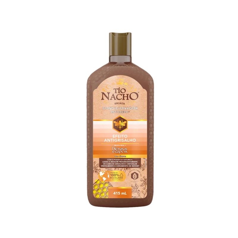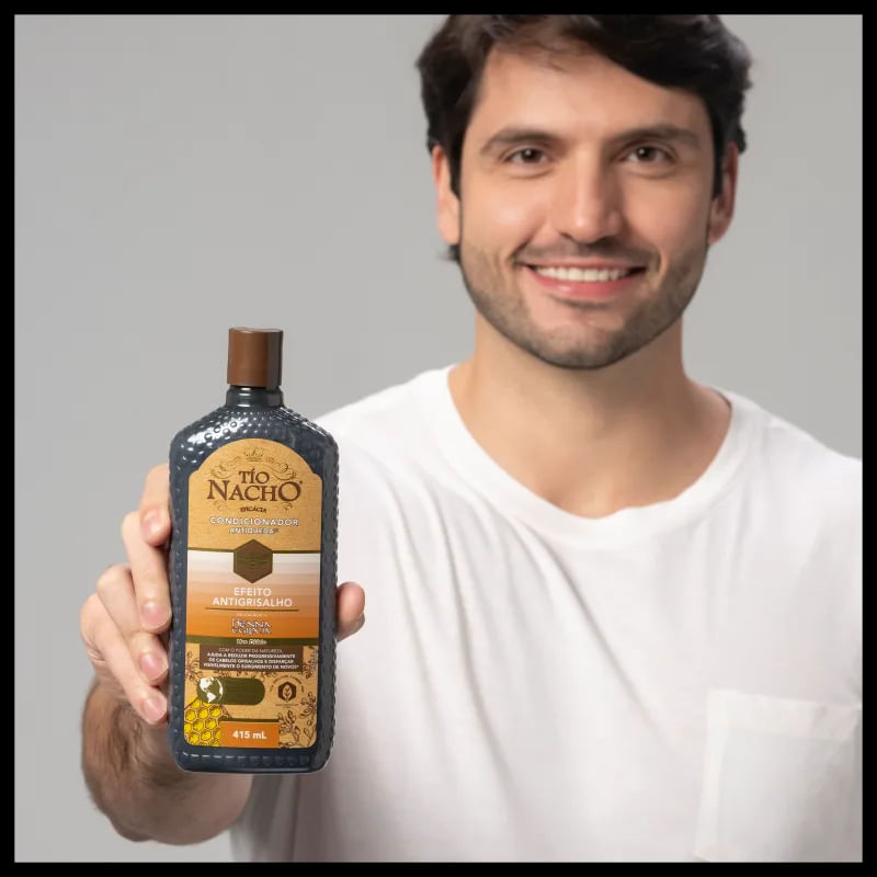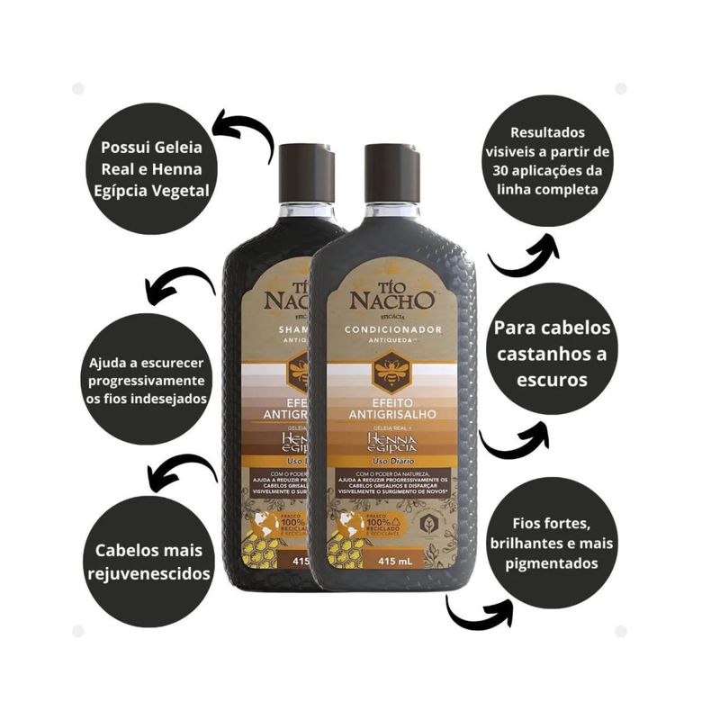 O que é e para que serve o Tío Nacho Efeito Antigrisalho? Com o poder da natureza, a linha Tío Nacho Antigrisalho ajuda a reduzir progressivamente os cabelos grisalhos e ocultar visivelmente a aparência de novos*. *Este produto adiciona cor aos cabelos grisalhos gradativamente, não os cobre 100% e não atua ao nível do bulbo capilar. Resultados visíveis a partir de 30 aplicações da linha completa (shampoo + condicionador). Benefícios e diferenciais Fórmula antiqueda*. Crescimento saudável dos fios. Cabelos longos mais fortes e com brilho. Promove resultados eficazes desde o primeiro uso. Desenvolvido com Geleia Real e ingredientes hidratantes de origem natural. *Queda devido à quebra