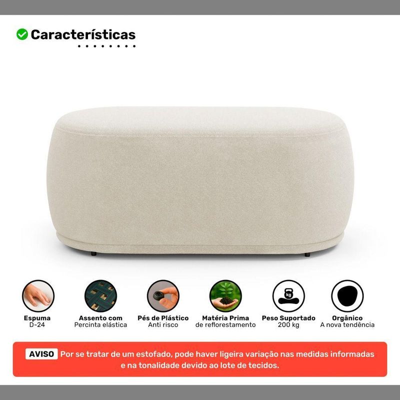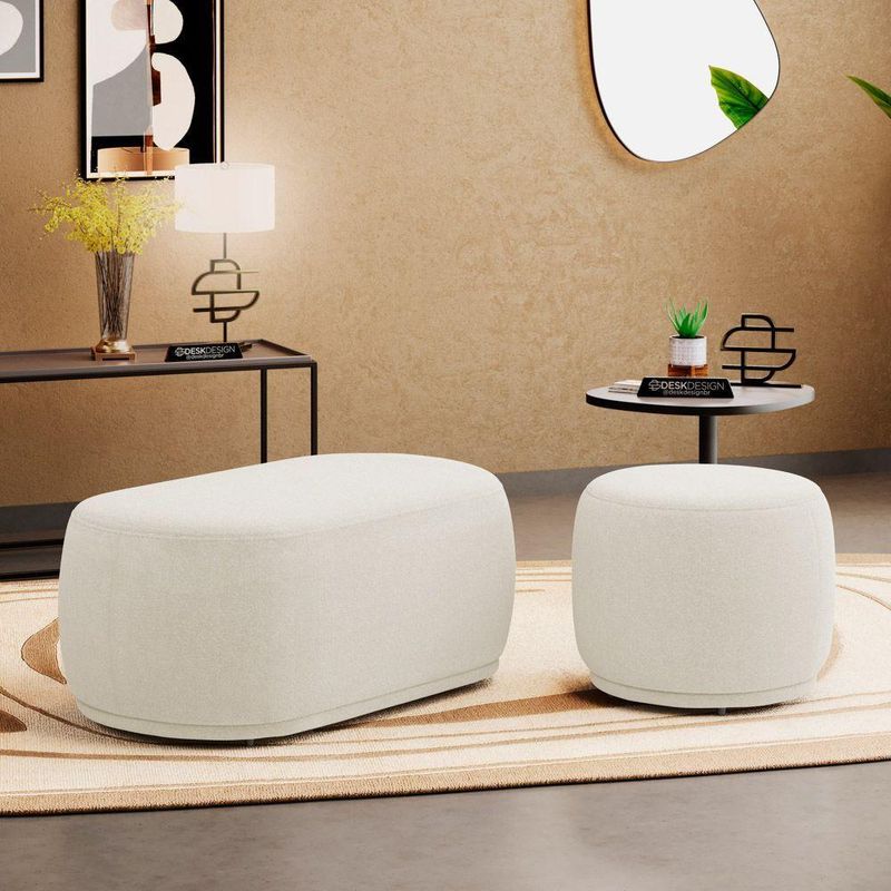 Conjunto 02 Puffs Decorativos Orgânicos Molly Bouclê Bege - Desk DesignConjunto 02 Puffs Decorativos Orgânicos Molly - Estilo contemporâneo, conforto e versatilidade para qualquer ambiente!O Conjunto de Puffs Molly é ideal para quem busca puffs decorativos com design orgânico e moderno. Composto por um puff para 1 lugar e outro para 2 lugares, oferece funcionalidade com estética minimalista em salas de estar, living, recepções e ambientes corporativos.Ambos os modelos possuem estrutura em madeira de eucalipto, espuma D-24 e percintas elásticas no assento, garantindo conforto, resistência e excelente custo-benefício. As sapatas plásticas completam o conjunto com mais proteção para o piso e praticidade no uso.- Puff com 1 e 2 lugares: Dois tamanhos versáteis para compor diferentes espaços com equilíbrio e estilo- Excelente custo-benefício: Dois produtos em um conjunto funcional, durável e cheio de charme- Estrutura em madeira de eucalipto: Alta resistência para o uso contínuo- Percintas elásticas no assento: Mais conforto e sustentação ao sentarAdicione o Conjunto de Puffs Molly ao seu décor e transforme seu ambiente com originalidade!Dimensões Aproximadas do Puff Maior:Largura: 106 cmAltura: 42 cmProfundidade: 58 cmAltura dos Pés: 2 cmPeso Aproximado: 18 kgDimensões Aproximadas do Puff Menor:Largura: 56 cmAltura: 42 cmProfundidade: 56 cmAltura dos Pés: 2 cmPeso Aproximado: 8 kgATENÇÃO:** PODE HAVER UMA PEQUENA VARIAÇÃO DE COR ENTRE O PRODUTO REAL E A IMAGEM ANUNCIADA DEVIDO AO LOTE DE TECIDOS.** POR SE TRATAR DE UM ESTOFADO, AS MEDIDAS PODEM SOFRER UMA VARIAÇÃO DE ATÉ 3 CM.** PRODUTO ENVIADO MONTADO. VERIFIQUE AS DIMENSÕES E ASSEGURE-SE DE QUE O ITEM PASSARÁ POR ELEVADORES, PORTAS, ESCADAS OU CORREDORES DA SUA RESIDÊNCIA.Características:Material da Estrutura: Madeira de EucaliptoMaterial do Estofamento: Espuma D-24Revestimento: BouclêPossui Pés: SimTipo de Pés: FixosMaterial dos Pés: PlásticoNúmero de Lugares: 1 e 2Peso Suportado: 100 kg (Menor) e 200 kg (Maior) Sem ImpactoAmbiente Principal: Sala de Estar, Recepção, Consultório, LivingTipo de Produto: Puff Redondo, Puff OrgânicoPossui Manual de Montagem: NãoDiferenciais:- Espuma D-24- Sapatas Plásticas Fixas- Design Orgânico- Percintas Elásticas no AssentoItens Inclusos:- 02 PuffsMontagem:- Complexidade da Montagem: Baixa.- Recomendamos que seja feita por um profissional qualificado.- Produto enviado montado.Garantia de Fábrica:90 dias contra defeito de fabricação.Limpeza e cuidados: Utilizar pano levemente umedecido com água, seguido de pano seco. Não utilizar produtos químicos ou abrasivos na limpeza. Evitar contato com objetos cortantes. Manter ao abrigo de local interno, sem ficar exposto diretamente ao sol, calor e umidade excessivo.Importante:- Pode haver ligeira diferença de tonalidade entre a imagem digital e o produto real por conta do tratamento de imagens e a calibração de cores do seu monitor.- As imagens são meramente ilustrativas, não acompanham objetos de decoração e eletrônicos.- Produto para uso residencial em ambiente interno, não devendo ficar exposto diretamente ao sol, calor e umidades excessivas.- Ao receber a mercadoria verifique a condição da embalagem, caso apresente violação ou esteja danificada não assine o comprovante de entrega.- Montagem, desmontagem e outras instalações é de inteira responsabilidade do cliente.- Caso resida em apartamento ou condomínio é indispensável que confira as dimensões do produto e certifique-se de que passará normalmente por elevadores, portas, escadas e/ou corredores de sua residência. Não nos responsabilizamos no ato da entrega, por subir escadas/elevadores ou pelo transporte por guincho em apartamentos. Eventuais despesas são de responsabilidade do comprador.
