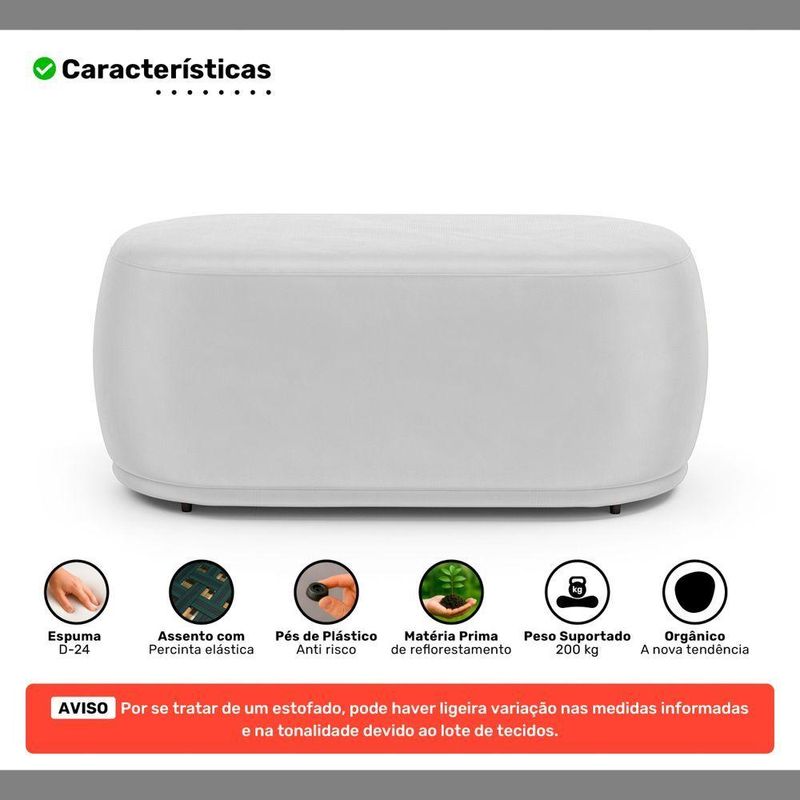 Conjunto 02 Puffs Decorativos Orgânicos Molly Couríssimo Branco - Desk Design Cor BrancoConjunto 02 Puffs Decorativos Orgânicos Molly - Estilo contemporâneo, conforto e versatilidade para qualquer ambiente!O Conjunto de Puffs Molly é ideal para quem busca puffs decorativos com design orgânico e moderno. Composto por um puff para 1 lugar e outro para 2 lugares, oferece funcionalidade com estética minimalista em salas de estar, living, recepções e ambientes corporativos.Ambos os modelos possuem estrutura em madeira de eucalipto, espuma D-24 e percintas elásticas no assento, garantindo conforto, resistência e excelente custo-benefício. As sapatas plásticas completam o conjunto com mais proteção para o piso e praticidade no uso.- Puff com 1 e 2 lugares: Dois tamanhos versáteis para compor diferentes espaços com equilíbrio e estilo- Excelente custo-benefício: Dois produtos em um conjunto funcional, durável e cheio de charme- Estrutura em madeira de eucalipto: Alta resistência para o uso contínuo- Percintas elásticas no assento: Mais conforto e sustentação ao sentarAdicione o Conjunto de Puffs Molly ao seu décor e transforme seu ambiente com originalidade!Dimensões Aproximadas do Puff Maior:Largura: 106 cmAltura: 42 cmProfundidade: 58 cmAltura dos Pés: 2 cmPeso Aproximado: 18 kgDimensões Aproximadas do Puff Menor:Largura: 56 cmAltura: 42 cmProfundidade: 56 cmAltura dos Pés: 2 cmPeso Aproximado: 8 kgATENÇÃO:** PODE HAVER UMA PEQUENA VARIAÇÃO DE COR ENTRE O PRODUTO REAL E A IMAGEM ANUNCIADA DEVIDO AO LOTE DE TECIDOS.** POR SE TRATAR DE UM ESTOFADO, AS MEDIDAS PODEM SOFRER UMA VARIAÇÃO DE ATÉ 3 CM.** PRODUTO ENVIADO MONTADO. VERIFIQUE AS DIMENSÕES E ASSEGURE-SE DE QUE O ITEM PASSARÁ POR ELEVADORES, PORTAS, ESCADAS OU CORREDORES DA SUA RESIDÊNCIA.Características:Material da Estrutura: Madeira de EucaliptoMaterial do Estofamento: Espuma D-24Revestimento: Couríssimo Sintético (PU)Possui Pés: SimTipo de Pés: FixosMaterial dos Pés: PlásticoNúmero de Lugares: 1 e 2Peso Suportado: 100 kg (Menor) e 200 kg (Maior) Sem ImpactoAmbiente Principal: Sala de Estar, Recepção, Consultório, LivingTipo de Produto: Puff Redondo, Puff OrgânicoPossui Manual de Montagem: NãoDiferenciais:- Espuma D-24- Sapatas Plásticas Fixas- Design Orgânico- Percintas Elásticas no AssentoItens Inclusos:- 02 PuffsMontagem:- Complexidade da Montagem: Baixa.- Recomendamos que seja feita por um profissional qualificado.- Produto enviado montado.Garantia de Fábrica:90 dias contra defeito de fabricação.Limpeza e cuidados: Utilizar pano levemente umedecido com água, seguido de pano seco. Não utilizar produtos químicos ou abrasivos na limpeza. Evitar contato com objetos cortantes. Manter ao abrigo de local interno, sem ficar exposto diretamente ao sol, calor e umidade excessivo.Importante:- Pode haver ligeira diferença de tonalidade entre a imagem digital e o produto real por conta do tratamento de imagens e a calibração de cores do seu monitor.- As imagens são meramente ilustrativas, não acompanham objetos de decoração e eletrônicos.- Produto para uso residencial em ambiente interno, não devendo ficar exposto diretamente ao sol, calor e umidades excessivas.- Ao receber a mercadoria verifique a condição da embalagem, caso apresente violação ou esteja danificada não assine o comprovante de entrega.- Montagem, desmontagem e outras instalações é de inteira responsabilidade do cliente.- Caso resida em apartamento ou condomínio é indispensável que confira as dimensões do produto e certifique-se de que passará normalmente por elevadores, portas, escadas e/ou corredores de sua residência. Não nos responsabilizamos no ato da entrega, por subir escadas/elevadores ou pelo transporte por guincho em apartamentos. Eventuais despesas são de responsabilidade do comprador.