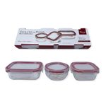 Conjunto 3 Potes De Vidro Com Tampa Hermética 150ml/170ml/250mlConjunto 3 Potes De Vidro Com Tampa Hermética 150ml/170ml/250mlEsse conjunto de potes é perfeito para armazenar ou preparar alimentos, com tampa hermética proporciona um ótimo fechamento, auxiliando numa maior durabilidade do conteúdo. Alta resistência térmica, pode ser utilizado no micro-ondas ou freezer. Produzido em vidro borossilicato assegura uma elevada durabilidade e resistência aos choques térmicos. ESPECIFICAÇÕES:- Material: Vidro Borossilicato e Plástico - Dimensões: Redondo 9,5cm diâmetro x 4,8cm altura / Quadrado 9,5cm largura x 9,5cm profundidade x 4,8cm altura / Retangular 13cm largura x 9,5cm profundidade x 4,8cm altura- Cor: Vidro transparente / Tampa com vedação vermelha - Capacidade: Redondo 150ml / Quadrado 170ml / Retangular 250ml- Quantidade: 03 unidades- Resistente à temperaturas: Forno 450ºC / Freezer -40ºC- Formato: Redondo, Quadrado e Retangular -Peso: ATENÇÃO: Não levar direto do freezer para o forno; Não colocar o recipiente quente em com água fria; Não leve a tampa plástica ao forno; Abra a tampa quando levar ao micro-ondas. CONTÉM:01 Kit com 3 Potes em Vidro com tampa Hermética 150ml / 170ml / 250ml