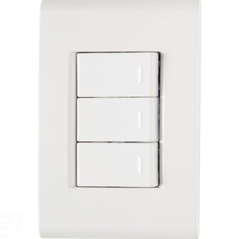 Conjunto 4x2 3 Interruptores Simples Tramontina Liz 10A 250V Branco Tramontina - Características Gerais do Produto: • Conjunto completo ou Módulo: Conjunto completo • Cor: Branco • Tipo / Função: Interruptor • Quantidade de Interruptores: 3 • Tipo de interruptor: Interruptor Simples Garantia: • 1 Ano