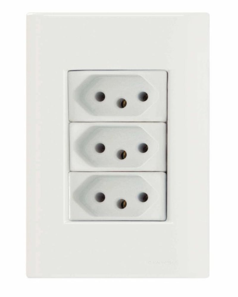 Conjunto 4x2 3 Tomadas 2P+T 10A 250V Tramontina Giz Branco Tramontina - Características Gerais do Produto: • Conjunto completo ou Módulo: Conjunto completo • Cor: Branco • Tipo / Função: Tomada • Quantidade de Tomadas: 3 • Corrente (A): 10A Garantia: • 1 Ano