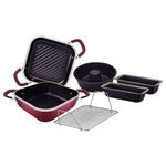 O kit Tramontina Lyon em alumínio forjado com revestimento interno e externo en antiaderente Starflon High Performance carmim 6 peças é a escolha perfeita para os apaixonados por culinária que valorizam qualidade e praticidade. A panela é produzida em alumínio e conta com um revestimento interno em antiaderente Starflon High Performance, garantindo um cozimento uniforme, sem que os alimentos grudem em sua superfície. Compatíveis com todos os tipos de fogões, a panela funciona como forno, permitindo o preparo de deliciosos pudins, bolos e carnes assadas diretamente na boca do fogão. Ele possui um design elegante que combina perfeitamente com qualquer estilo de cozinha e é perfeito para o preparo dos pratos mais saborosos do seu livro de receitas! - Destaques:• Corpo de alumínio forjado com espessura de 8,0 mm que proporciona cozimento rápido e uniforme.• Tampa grill de alumínio com espessura de 8,0 mm que proporciona cozimento rápido e uniforme.• Revestimento interno e externo de antiaderente Starflon High Performance que não gruda, é fácil de limpar, mais durável, não é prejudicial à saúde e é livre de PFOA.• Alças em aço inox com proteção de silicone oferecendo maior segurança durante o uso.• É possível assar, cozinhar, fritar e descongelar.• Grelha de aço inox.• Formas para pão e bolo com revestimento interno e externo de antiaderente Starflon Max que não gruda, é fácil de limpar, mais durável, não é prejudicial à saúde e é livre de PFOA.• Forma para bolo com com revestimento interno e externo de antiaderente Starflon Premium que não gruda, é fácil de limpar, mais durável, não é prejudicial à saúde e é livre de PFOA.• Pode ir à máquina de lavar louças, porém, para maior durabilidade do produto, indicamos lavar manualmente.• Pode ser utilizada nos fogões: gás, elétrico, vitrocerâmico - resistência elétrica e indução. - Especificações:• Forma de bolo: 24cm x 25,5cm x 8,6cm (C x L x A)• Forma de pão: 25,9cm x 12,5cm x 7cm (C x L x A)• Caçarola: 28cm x 30cm x 14cm (C x L x A)• Grelha: 23cm x 8cm (L x A)• Material: Alumínio forjado