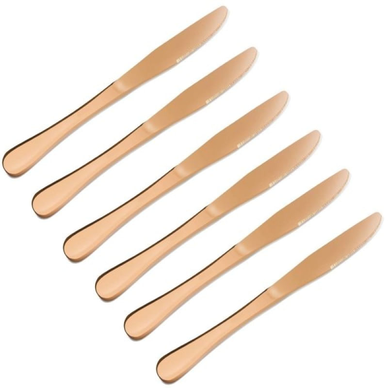 Conjunto 6pçs Facas Refeição Inox Rose Gold Luxo Rústico - Transforme Suas Refeições com Nossos Talheres Elegantes! Descubra a coleção premium de talheres que traz elegância e sofisticação para sua mesa. Com design moderno e materiais de alta qualidade, nossos talheres são perfeitos para todas as ocasiões, desde jantares especiais até refeições do dia a dia. Talheres de aço inoxidável resistente, Durabilidade e resistência, Design ergonômico e confortável, Fácil de limpar e manter e Perfeito para presentes! ESPECIFICAÇÕES: MATERIAL: Aço Inox; COR: Dourado (Rose Gold) MEDIDAS: 23cm X 2cm CONTEÚDO DA EMBALAGEM: 1 Conjunto De 6 Peças De Facas; Características Gerais do Produto: • Material: Aço Inox • Modelo: Talher Rose Gold • Cor: Dourado • Dimensões aproximadas: Altura 23cm X Largura 2cm Garantia: • Garantia contra avarias no transporte