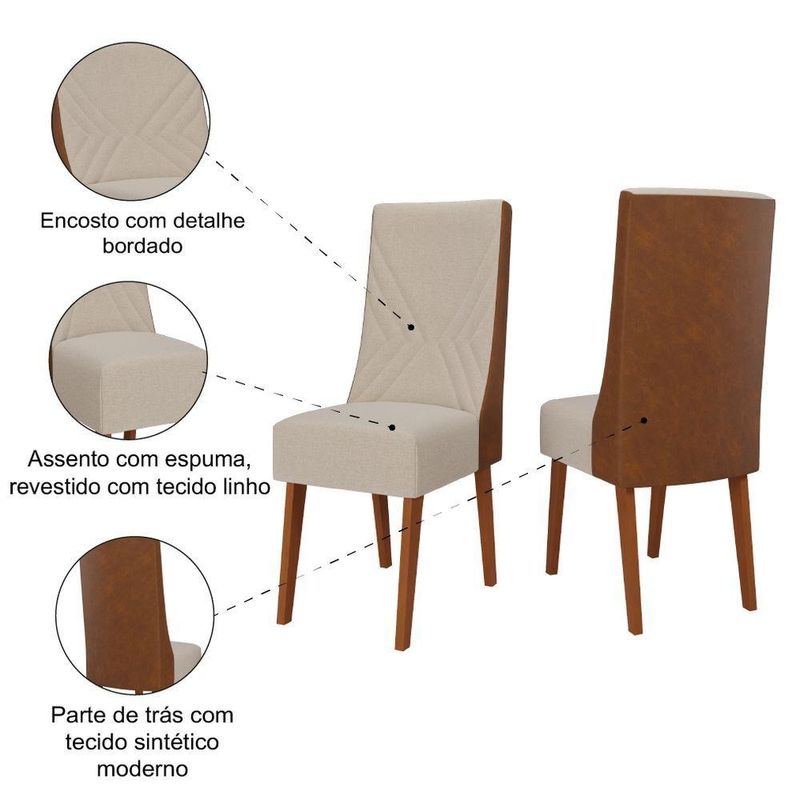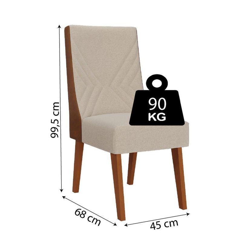 Conjunto Com 2 Cadeiras Estofadas Sala De Jantar Tifany Madeirado/bege Claro Viero Madeirado / BegeO conjunto 2 cadeiras Tifany é a escolha perfeita para cozinhas e salas de jantar que buscam conforto e estilo. As cadeiras Tifany são projetadas para combinar charme e resistência, transformando seu espaço em um aconchegante e elegante. O encosto com bordados e revestido com tecido linho adiciona um toque de personalidade e sofisticação ao design. A parte traseira em tecido sintético traz um contraste moderno e fácil de limpar. Enquanto isso, o assento com espuma oferece conforto ideal para o uso diário. Os pés em madeira maciça garantem estabilidade e durabilidade, tornando o conjunto uma escolha duradoura e prática para seu lar.MEDIDAS:[ A ] = 99,5 cm[ L ] = 45 cm[ P ] = 68 cmPESO: 18 KgPESO SUPORTADO: 90 Kg cadaMODELO: Conjunto com 2 Cadeiras Estofadas Sala de Jantar Tifany VieroMARCA: VieroESTRUTURA: Madeira MaciçaACABAMENTO: Pintura VernizTECIDO: Linho e Tecido sintéticoREVESTIMENTO ASSENTO: Espuma D26PÉS: Madeira MaciçaSAPATAS: PlásticasDIFERENCIAL: Cadeira com encosto bordado, tecido linho e sintético, base madeira maciça.SISTEMA DE MONTAGEM: Parafusos e cavilhasITENS INCLUSOS: 2 cadeiras, 1 manual de montagem e 1 kit parafusosINSTRUÇÕES E CUIDADOS: Limpar com pano levemente umedecido com água, não utilizar produtos abrasivosGARANTIA: 3 meses pelo fabricanteImportante sobre a : A é realizada até a portaria ou porta de entrada do indicado, desde que o acesso seja permitido. Para locais com portaria, a será feita no piso térreo. Não realizamos montagem, desmontagem, por escadas ou içamento. É responsabilidade do cliente verificar se as dimensões do produto são compatíveis com portas, elevadores e corredores. Evite imprevistos: confira todos os detalhes antes de concluir sua compra. MEDIDAS:: [ A ] = 99,5 cm [ L ] = 45 cm [ P ] = 68 cm | PESO:: 18 Kg | PESO SUPORTADO:: 90 Kg cada | MODELO:: Conjunto com 2 Cadeiras Estofadas Sala de Jantar Tifany | MARCA:: Viero | COR:: Estrutura: Madeirado / Assento: Madeirado/Bege Claro | ESTRUTURA:: Madeira Maciça | ACABAMENTO:: Pintura Verniz | TECIDO:: Linho e Tecido sintético | REVESTIMENTO ASSENTO:: Espuma D26 | PÉS:: Madeira Maciça | SAPATAS:: Plásticas | DIFERENCIAL:: Cadeira com encosto bordado, tecido linho e sintético, base madeira maciça. | SISTEMA DE MONTAGEM:: Parafusos e cavilhas | ITENS INCLUSOS:: 2 cadeiras, 1 manual de montagem e 1 kit parafusos | INSTRUÇÕES E CUIDADOS:: Limpar com pano levemente umedecido com água, não utilizar produtos abrasivos | GARANTIA:: 3 meses pelo fabricante | AVISO: Importante sobre a : A é realizada até a portaria ou porta de entrada do indicado, desde que o acesso seja permitido. | Altura da cadeira: 99,5 | Inclui manual de montagem: Sim | Largura do assento: 45 | Profundidade do assento: 68 | Quantidade de cadeiras por conjunto: 2 | Requer montagem: Sim | Cor: Madeirado / Bege