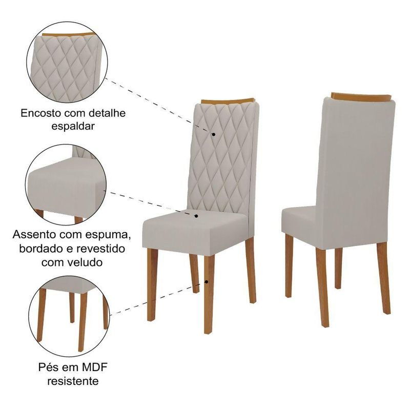 Conjunto Com 2 Cadeiras Estofadas Veludo Sala De Jantar Bele Viero Madeirado / BegeO conjunto de 2 cadeiras Bele é a escolha perfeita para cozinhas e salas de jantar que buscam conforto e estilo. As cadeiras são projetadas para combinar charme e resistência, transformando seu espaço em um aconchegante e elegante. O encosto com bordados adiciona um toque de personalidade e sofisticação ao design, enquanto o assento com espuma oferece conforto ideal para o uso diário. Revestidas em tecido veludo, as cadeiras proporcionam um visual sofisticado e agradável ao toque. Os pés em MDF completam a peça com estabilidade e durabilidade, garantindo que seja uma escolha duradoura e prática para seu lar.MEDIDAS:[ A ] = 101 cm[ L ] = 42 cm[ P ] = 58,5 cmPESO: 16,5 KgPESO SUPORTADO: 90 Kg cadaMODELO: Conjunto com 2 Cadeiras Estofadas Veludo Sala de Jantar Bele VieroMARCA: VieroESTRUTURA: MDP/MDFTECIDO: Veludo toque macioREVESTIMENTO ASSENTO: Espuma D26PÉS: MDFSAPATAS: PlásticasDIFERENCIAL: Cadeira com encosto bordado, e espalda, pés em MDF, revestimento em tecido veludoSISTEMA DE MONTAGEM: Parafusos e cavilhasITENS INCLUSOS: 2 cadeiras, 1 manual de montagem e 1 kit parafusosINSTRUÇÕES E CUIDADOS: Limpar com pano levemente umedecido com água, não utilizar produtos abrasivosGARANTIA: 3 meses pelo fabricanteImportante sobre a : A é realizada até a portaria ou porta de entrada do indicado, desde que o acesso seja permitido. Para locais com portaria, a será feita no piso térreo. Não realizamos montagem, desmontagem, por escadas ou içamento. É responsabilidade do cliente verificar se as dimensões do produto são compatíveis com portas, elevadores e corredores. Evite imprevistos: confira todos os detalhes antes de concluir sua compra. MEDIDAS:: [ A ] = 101 cm [ L ] = 42 cm [ P ] = 58,5 cm | PESO:: 16,5 Kg | PESO SUPORTADO:: 90 Kg cada | MODELO:: Conjunto com 2 Cadeiras Estofadas Veludo Sala de Jantar Bele Viero | MARCA:: Viero | ESTRUTURA:: MDP/MDF | TECIDO:: Veludo toque macio | REVESTIMENTO ASSENTO:: Espuma D26 | PÉS:: MDF | SAPATAS:: Plásticas | DIFERENCIAL:: Cadeira com encosto bordado, e espalda, pés em MDF, revestimento em tecido veludo | SISTEMA DE MONTAGEM:: Parafusos e cavilhas | ITENS INCLUSOS:: 2 cadeiras, 1 manual de montagem e 1 kit parafusos | INSTRUÇÕES E CUIDADOS:: Limpar com pano levemente umedecido com água, não utilizar produtos abrasivos | GARANTIA:: 3 meses pelo fabricante | AVISO: Importante sobre a : A é realizada até a portaria ou porta de entrada do indicado, desde que o acesso seja permitido. | Altura da cadeira: 101 | Inclui manual de montagem: Sim | Largura do assento: 42 | Profundidade do assento: 58,5 | Quantidade de cadeiras por conjunto: 2 | Requer montagem: Sim | Cor: Madeirado / Bege