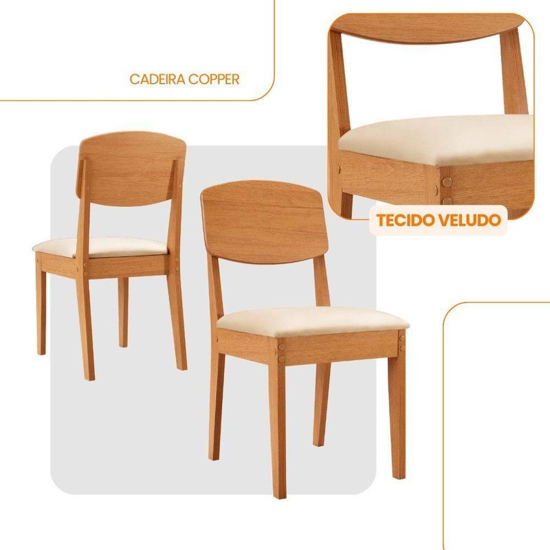 Conjunto Com 2 Cadeiras MDF Copper Para Sala De Jantar Moderna Veludo Capuccino/NaturalleA cadeira Copper combina design contemporaneo e conforto, com encosto em MDF moldado que oferece suporte ergonomico ideal. Seu estofado acolhedor garante um assento confortavel, enquanto o acabamento refinado e detalhes sofisticados valorizam seu visual, tornando-a perfeita para ambientes modernos e elegantes.Caracteristicas:Marca: Moderna MobiliaModelo: CopperMaterial: MDFDimensoes da Cadeira:Altura: 91 cmLargura: 45 cmProfundidade: 54 cmGarantia do Fabricante: 03 meses.Observacoes:Os objetos que ambientam as fotos nao acompanham o produto.Nao disponibilizamos a montagem do produto.O produto acompanha manual de montagem. Nao nos responsabilizamos por danos no produto causados por montagem de qualquer outra forma que nao seja a descrita no manual.Verifique as dimensoes do produto e certifique-se que o percurso que ele fara ate o local de uso permite sua passagem.A Moderna Mobilia reserva o direito de alterar as especificacoes tecnicas sem previo aviso.As medidas contidas no site podem sofrer variacoes de acordo com a montagem, tipo de costura etc.A montagem sera de responsabilidade do comprador.Nao nos responsabilizamos, no ato da entrega, por subir escadas/elevadores em apartamentos.Eventuais despesas sao de responsabilidade do comprador.As tonalidades das cores podem sofrer alteracao de acordo com a configuracao de cada monitor.