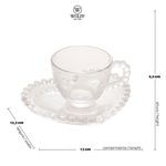 Esse incrível Conjunto de Xícaras Pearl Coração da Wolff é ideal para garantir uma mesa bonita, organizada e atrativa, tanto para você, quanto para seus convidados!Esse jogo de xícaras é perfeito para quem ama apreciar um delicioso chá, um café fresquinho, um cremoso cappuccino, ou um chocolate quente encorpado, a qualquer hora do dia! As xícaras possuem capacidade para 85 ml e poderão comportar qualquer bebida de sua preferência. Já os pires são práticos e funcionais, perfeitos para sobrepor as xícaras, alocar a colher de adoçar, ou ainda, para servir pequenos biscoitos, chocolates ou cookies.As peças possuem um design especialmente desenhado para agregar elegância e versatilidade em sua decoração, com uma estética delicada, formato de coração e lapidação de bolinhas inspirada na beleza e no brilho único das pérolas, adicionando um toque leve, sutil, harmônico e muito sofisticado para a composição de sua mesa.Além disso, a coleção Pearl Coração da Wolff é fabricada em Cristal de excelente qualidade, que não mancha, não libera substâncias e não armazena odor. Esse material translúcido também é brilhante e cristalino, pois permite maior incidência de luz, proporcionando muito mais beleza e estilo para o visual do conjunto.