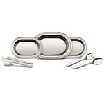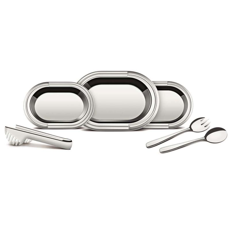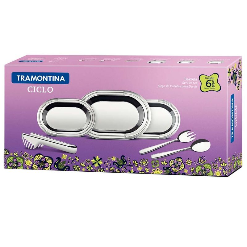 Beleza e praticidade em seu formato! O jogo de baixelas da Tramontina possui seis peças, ideais para servir arroz, massas, saladas, peixe e outros alimentos. São feitas em aço inoxidável que garantem durabilidade, além de serem higiênicas e de fácil limpeza. Possui acabamento em brilho e detalhes em alto relevo fosco. E para tornar sua vida muito mais prática, podem ser lavadas, diariamente na máquina de lavar louças!