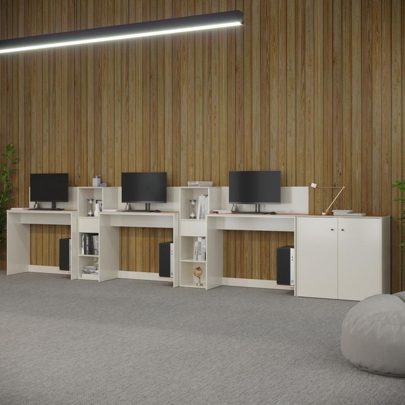 Conjunto De Escritório Tech 2 Livreiro 1 Buffet E 3 Mesas 90 - Off White E Cedro Off White E CedroO Conjunto de Escritório Tech é compacto e funcional, ideal para ambientes profissionais e home office. Contando com sua Escrivaninha com passa fios e suporte para CPU, Buffet Aparador com 2 Portas e dobradiças metálicas e o Armário é compacto e funcional, com 3 nichos e 1 gaveta. Todos com tampo em MDF usinado e sapatas de PVC, unindo design moderno e praticidade. Confira a linha Tech completa em nossos anúncios e transforme seu espaço com inteligência e estilo!Especificações Técnicas do Conjunto de Escritório Tech :- Material: MDP/MDF;- Tampo: MDF usinado;- Acabamento: Pintura UV;- Produto Precisa de Montagem? Sim;- de Portas: 2;- de Gavetas: 2;- de Prateleiras: 2;- Puxadores: PVC;- Dobradiças: Metálicas;- Pés: Sapatas Fixas de PVC;- Instruções de Cuidado: Limpar com pano levemente umedecido;- Medidas do Livreiro (Altura x Largura x Profundidade): 99,5 x 33,4 x 28,5 cm;- Medidas da Escrivaninha (Altura x Largura x Profundidade): 73,5 x 91 x 38,4 cm;- Conteúdo da Embalagem: 03 Escrivaninha, 02 Livreiro, 01 Buffet e 01 Kit Divisórias - Entregue em: 7 Volumes.Observações Importantes:Produto não deve ficar exposto diretamente ao sol, calor e umidades excessivas.Recomendações de Limpeza: Utilize somente pano seco ou levemente umedecido.Imagens meramente ilustrativas, produto não acompanha objetos de decoração e eletrônicos.Ao receber, verifique a embalagem. Se detectar ou violação na mesma, recuse o e nos contate.Não nos responsabilizamos pela montagem e por problemas causados pela montagem realizada por você ou montador contratado.Enfatizamos a recomendação aos nossos clientes de contratar um montador .Eventualmente, se faltar qualquer peça ou acessório no produto, nos contate e enviaremos a peça/acessório sem custo adicional. Altura da Mesa (cm): 74cm | Altura do Armário (cm): 99cm | Altura do Aparador (cm): 74cm | Largura da Mesa (cm): 91cm | Largura do Armário (cm): 33cm | Largura do Aparador (cm): 77cm | Profundidade da Mesa (cm): 38cm | Profundidade do Armário (cm): 28cm | Profundidade do Aparador (cm): 38cm | Altura dos Pés (cm): Não se aplica | Ambiente Principal: Escritório | Complexidade da Montagem: Média: pode ser montado por mais de uma pessoa e/ou necessite de maior conhecimento para montagem | Cor do Produto: Off White/Cedro | Cor Predominante: Off White | Cor Interna: Off White | Acabamento: Pintura UV | Acabamento da Gaveta: Pintura UV | Acabamento dos Pés: PVC | Escala de Brilho: Fosco | Escala de Brilho da Gaveta: Fosco | Garantia: 3 meses | Bandeja: Não | Estilo: Moderno | Itens Inclusos: 2 Livreiro, 1 Buffet, 3 Mesas, Manual de Montagem e Kits de Montagem | Linha ou Coleção: Tech | Inclui manual de montagem: Sim | Possui Portas: Sim | Possui Rodízio: Não | Marca: ViaNossa | Material da Gaveta: MDP/MDF | Material dos Pés: PVC | Cor: Off White e Cedro