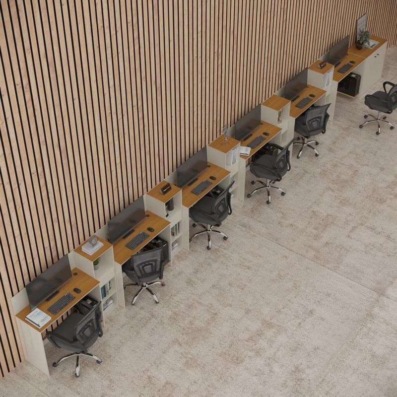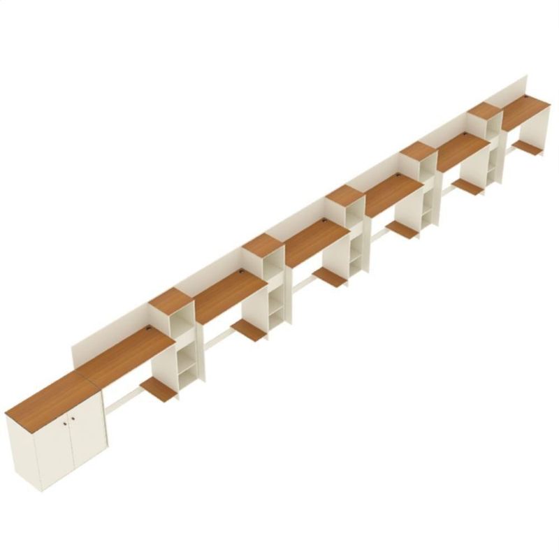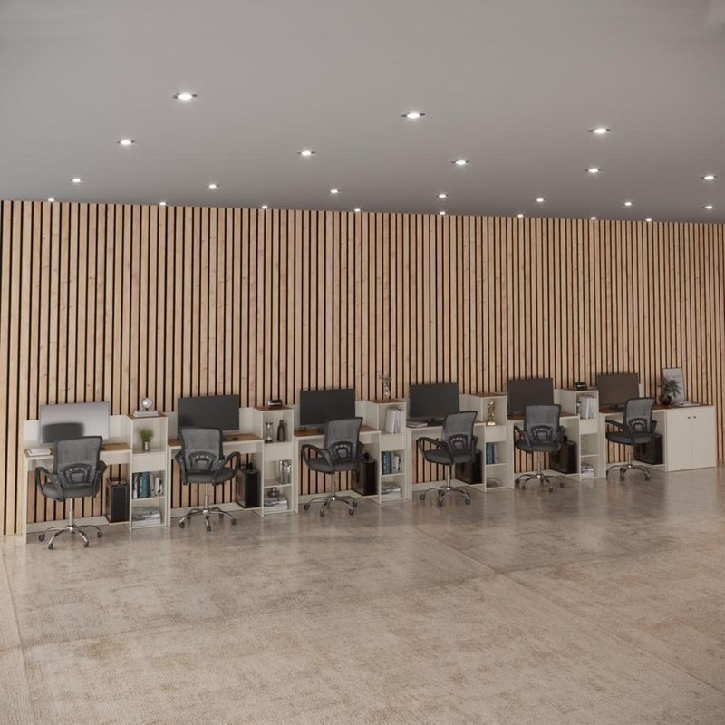 Conjunto De Escritório Tech 5 Livreiro 1 Buffet E 6 Mesas 90 - Off White E Cedro Off White E CedroO Conjunto de Escritório Tech é compacto e funcional, ideal para ambientes profissionais e home office. Contando com sua Escrivaninha com passa fios e suporte para CPU, Buffet Aparador com 2 Portas e dobradiças metálicas e o Armário é compacto e funcional, com 3 nichos e 1 gaveta. Todos com tampo em MDF usinado e sapatas de PVC, unindo design moderno e praticidade. Confira a linha Tech completa em nossos anúncios e transforme seu espaço com inteligência e estilo!Especificações Técnicas do Conjunto de Escritório Tech :- Material: MDP/MDF;- Tampo: MDF usinado;- Acabamento: Pintura UV;- Produto Precisa de Montagem? Sim;- de Portas: 2;- de Gavetas: 5;- de Prateleiras: 5;- Puxadores: PVC;- Dobradiças: Metálicas;- Pés: Sapatas Fixas de PVC;- Instruções de Cuidado: Limpar com pano levemente umedecido;- Medidas do Livreiro (Altura x Largura x Profundidade): 99,5 x 33,4 x 28,5 cm;- Medidas da Escrivaninha (Altura x Largura x Profundidade): 73,5 x 91 x 38,4 cm;- Conteúdo da Embalagem: 06 Escrivaninha, 05 Livreiro, 01 Buffet e 03 Kit Divisórias - 15 Entregue em: Volumes.Observações Importantes:Produto não deve ficar exposto diretamente ao sol, calor e umidades excessivas.Recomendações de Limpeza: Utilize somente pano seco ou levemente umedecido.Imagens meramente ilustrativas, produto não acompanha objetos de decoração e eletrônicos.Ao receber, verifique a embalagem. Se detectar ou violação na mesma, recuse o e nos contate.Não nos responsabilizamos pela montagem e por problemas causados pela montagem realizada por você ou montador contratado.Enfatizamos a recomendação aos nossos clientes de contratar um montador .Eventualmente, se faltar qualquer peça ou acessório no produto, nos contate e enviaremos a peça/acessório sem custo adicional. Altura da Mesa (cm): 74cm | Altura do Armário (cm): 99cm | Altura do Aparador (cm): 74cm | Largura da Mesa (cm): 91cm | Largura do Armário (cm): 33cm | Largura do Aparador (cm): 77cm | Profundidade da Mesa (cm): 38cm | Profundidade do Armário (cm): 28cm | Profundidade do Aparador (cm): 38cm | Altura dos Pés (cm): Não se aplica | Ambiente Principal: Escritório | Complexidade da Montagem: Média: pode ser montado por mais de uma pessoa e/ou necessite de maior conhecimento para montagem | Cor do Produto: Off White/Cedro | Cor Predominante: Off White | Cor Interna: Off White | Acabamento: Pintura UV | Acabamento da Gaveta: Pintura UV | Acabamento dos Pés: PVC | Escala de Brilho: Fosco | Escala de Brilho da Gaveta: Fosco | Garantia: 3 meses | Bandeja: Não | Estilo: Moderno | Itens Inclusos: 5 Livreiro, 1 Buffet, 6 Mesas, Manual de Montagem e Kits de Montagem | Linha ou Coleção: Tech | Inclui manual de montagem: Sim | Possui Portas: Sim | Marca: ViaNossa | Possui Rodízio: Não | Material da Gaveta: MDP/MDF | Material dos Pés: PVC | Cor: Off White e Cedro