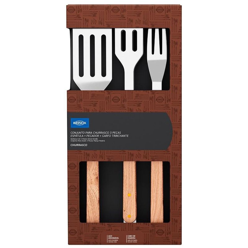 Acrescente mais praticidade e elegância aos churrascos com os amigos e a família, leve agora mesmo o Kit para Churrasco da Brinox. Contém 1 espátula, 1 pegador e 1 garfo com lâmina em aço inox e cabo de madeira que vão te ajudar no manuseio da carne na churrasqueira, bem como na hora de servir aos convidados. São peças essenciais, de qualidade e resistência que vão tornar os eventos ainda melhores.