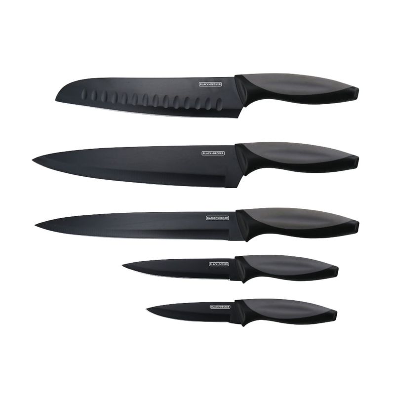 Conjunto De Facas 5 Peças Arko - Lâmina Com Revestimento Antiaderente E Cabo Com Revestimento De Toque Suave - Black+DeckerO Conjunto De Facas Arko Black+Decker Oferece Precisão E Conforto Para Todas As Suas Necessidades Culinárias, Com Lâminas Antiaderentes E Cabos De Toque Suave.Descrição Detalhada:Transforme Sua Experiência Na Cozinha Com O Conjunto De Facas Arko 5 Peças Black+Decker. Desenvolvido Para O Uso Geral Na Cozinha, Este Conjunto É A Escolha Perfeita Para Quem Busca Eficiência E Durabilidade. As Lâminas São Fabricadas Em Aço Inoxidável De Alta Qualidade E Contam Com Um Revestimento Antiaderente Que Facilita O Corte E Evita Que Os Alimentos Grudem, Tornando O Preparo De Suas Refeições Muito Mais Prático. O Design Moderno É Complementado Pelos Cabos Ergonômicos De Polipropileno, Que Possuem Um Revestimento De Toque Suave Na Cor Preta, Garantindo Um Manuseio Confortável E Seguro Mesmo Durante O Uso Prolongado. Ideal Para Chefs Amadores E Profissionais, Este Conjunto De Facas Black+Decker É Um Item Essencial Para Uma Cozinha Completa E Funcional.Diferenciais:Lâminas Com Revestimento Antiaderente: Permitem Um Corte Suave E Preciso, Além De Facilitar A Limpeza, Pois Os Alimentos Não Aderem À Superfície.Cabos Com Revestimento De Toque Suave: Proporcionam Uma Pegada Confortável E Segura, Reduzindo A Fadiga Das Mãos E Oferecendo Maior Controle Durante O Manuseio.Conjunto Completo E Versátil: Inclui 5 Peças Essenciais Para Diversas Tarefas Culinárias, Desde O Corte De Carnes E Pães Até O Preparo De Legumes E Frutas.Mais Sobre O Produto:Fabricadas Em Aço Inoxidável De Alta Resistência, As Lâminas Oferecem Alta Resistência À Corrosão, Garantindo A Longevidade Do Seu Conjunto.O Design Elegante Na Cor Preta Com Detalhes Em Prata Se Adapta Perfeitamente A Qualquer Decoração De Cozinha Moderna, Unindo Funcionalidade E Estilo.Embalado Em Uma Caixa De Presente, É Uma Excelente Opção Para Presentear Entusiastas Da Culinária Ou Equipar Sua Própria Cozinha Com Utensílios De Qualidade Superior.Dicas De Uso:Para Manter A Qualidade Do Revestimento E A Durabilidade Do Cabo, Recomendamos Lavar À Mão Após Cada Uso, Utilizando Sabão Neutro E Uma Esponja Macia.Evite O Uso De Produtos Abrasivos Ou Palhas De Aço Que Possam Danificar O Revestimento Antiaderente E O Acabamento Do Cabo.Seque As Facas Imediatamente Após A Lavagem Para Prevenir Manchas E Prolongar Sua Vida Útil. Guarde-As Em Um Local Seguro Para Proteger As Lâminas