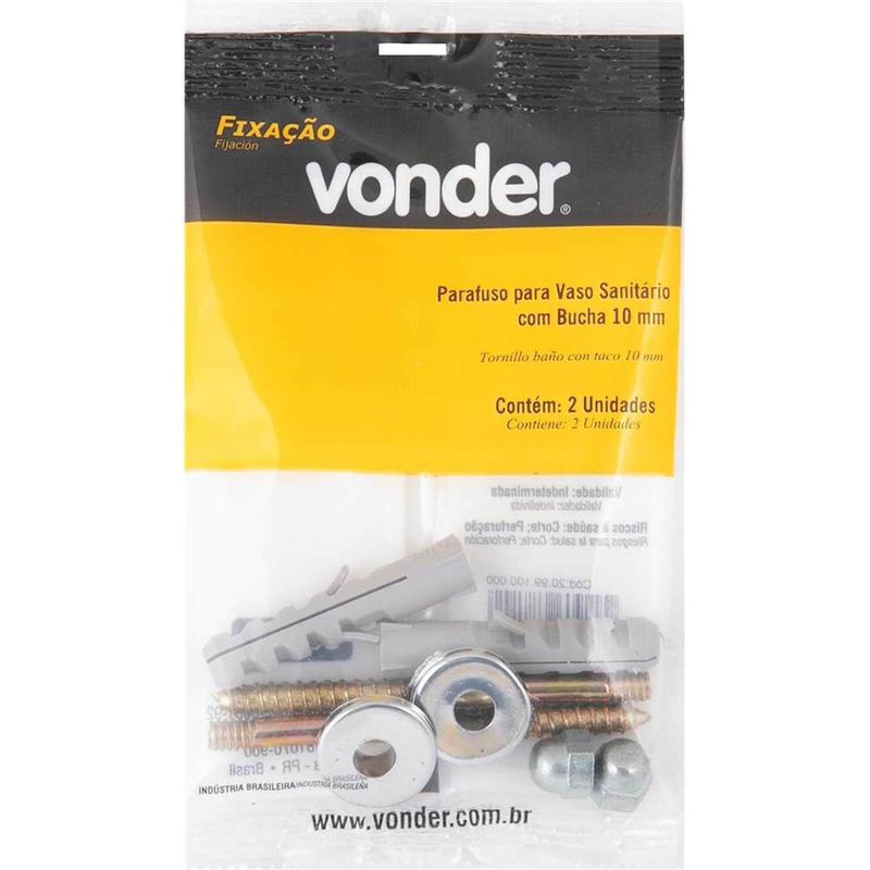 Conjunto de Fixação Para Vaso Sanitário, 10 mm, Latonado, Vonder - Conteúdo da embalagem: 1 Cartela com 2 conjuntos para lavatório e sanitário, composto por: haste, porca calota, anilha e bucha (10 mm) com anel. Aplicação: Indicado para fixação de sanitários, vasos, bidês e tanques. Destaques: Possui acabamento cromado, proporcionando maior resistência contra oxidação/corrosão. Referência: 2099100000 Garantia - E (CDC): Garantia legal: 90 dias Material do parafuso para lavatório/sanitário: Aço Latonado Acabamento do parafuso: Cromado Tipo de cabeça do parafuso para lavatório/sanitário: Sextavada Diâmetro da cabeça do parafuso: 1/4" Comprimento do parafuso: 81,7 mm Material da bucha: Poliamida Diâmetro da bucha do parafuso: 10,0 mm Massa aproximada (peso): 0,049 kg Destaques Comercial: Possui acabamento cromado, proporcionando maior resistência contra oxidação/corrosão. Aplicação Comercial: Indicado para fixação de sanitários, vasos, bidês e tanques. Características Gerais do Produto: Garantia: • 3 Meses
