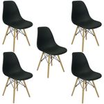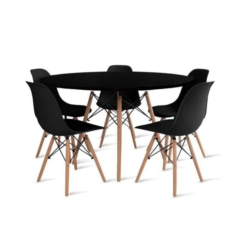 Conjunto De Mesa De Jantar Eames Eiffel Redonda 100cm Tampo De Madeira Com 5 Cadeiras PretaO Conjunto de Mesa de Jantar Eames Eiffel é a combinação perfeita de elegância e funcionalidade. Com uma mesa redonda de 100cm de diâmetro e tampo em MDF preto, ele traz um toque de sofisticação e luminosidade para sua sala de jantar. A base da mesa e das 5 cadeiras Eiffel são em madeira maciça, garantindo durabilidade e resistência. As cadeiras, com assento em polipropileno, oferecem conforto e um design atemporal que se adapta facilmente a qualquer ambiente.Características do ProdutoTipo: Conjunto de Mesa de JantarModelo: Eames EiffelCor: PretoDimensõesMesaAltura: 76cmDiâmetro: 100cmMaterial do tampo: MDF com pintura impermeávelBase: Madeira maciçaCadeirasAltura: 85cmLargura: 47cmProfundidade: 50cmAssento x Chão: 45cmMaterial: Polipropileno + Base em Madeira MaciçaPeso máximo suportado por cadeira: 120kgContém1 Mesa Eames Eiffel 100cm5 Cadeiras Eiffel pretasObservaçõesImagens meramente ilustrativas.