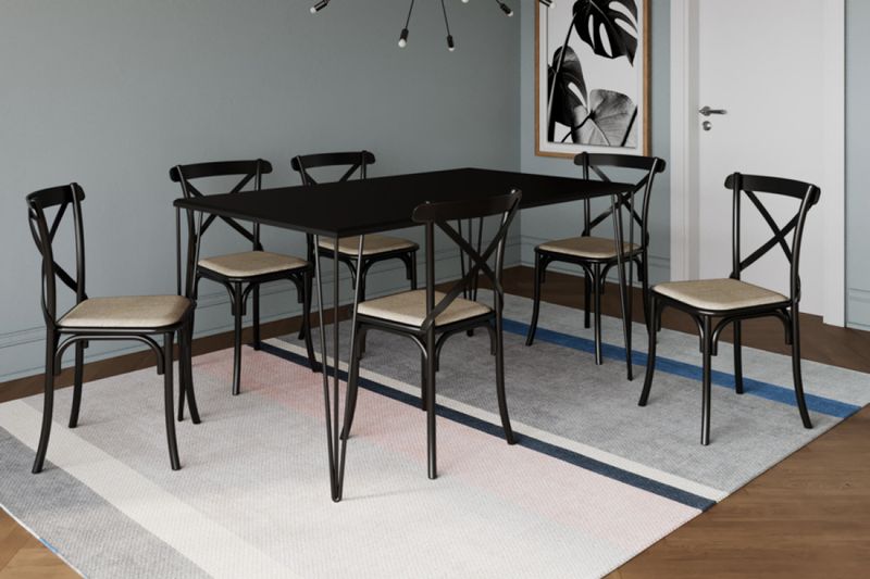 O Conjunto de Jantar Elen com 6 Cadeiras Katrina possui design clean, além de ser prático, versátil e de fácil combinação com diversos estilos de ambientes, seja interno ou externo. É o toque que falta para completar a sua sala de jantar. Conta com sofisticados tubos de aço, que garante maior resistência e durabilidade para a peça. Medidas mesa: Altura 76 cm Comprimento 150 cm Largura 90 cm Medidas cadeira: Altura 90 cm Largura 55 cm Profundidade 50 cm Materiais Mesa: Ferro maciço Tampo de de MDP Pintura eletrostática Materiais cadeira: Aço carbono Assento em MDF, espuma ]D23 e Corano Pintura eletrostática