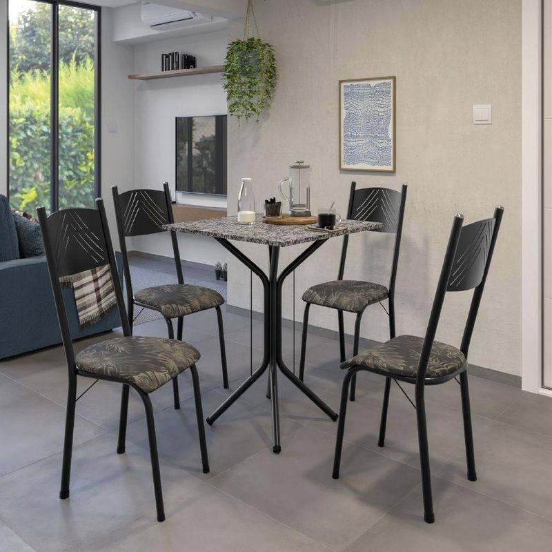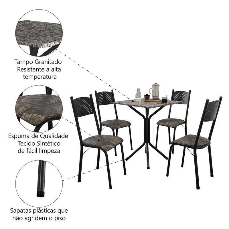 Conjunto De Mesa Sala De Jantar Thais Com 4 Cadeiras Granito Tubular Artefamol Preto/florO Conjunto Sala de Jantar Mesa Thais com 4 Cadeiras , foi desenvolvido para trazer ainda mais beleza e conforto para o seu lar. Possui tampo quadrado em granito resistente a altas temperaturas, e as cadeiras são revestidas em tecido sintético de fácil limpeza. Ainda conta com a base da mesa e das cadeiras de aço, garantindo resistência e durabilidade.MEDIDAS:Medidas da mesa:A = 75 cmL = 70 cmP = 70 cmMedidas das cadeiras:A = 92 cmL = 34 cmP = 41 cmPESO MESA: 27,3 Kg (Base + Tampo)PESO CADEIRA: 2,36 Kg cadaPESO SUPORTADO PELA MESA: 25 Kg distribuídosPESO SUPORTADO POR CADEIRA (cada): 120 KgMODELO: Conjunto de Mesa Sala De Jantar Thais Com 4 Cadeiras Granito TubularMARCA: ArtefamolESTRUTURA: Base e Cadeira de AçoMATERIAL DO TAMPO: GranitoACABAMENTO: LisoTECIDO DA CADEIRA: SintéticoREVESTIMENTO INTERIOR DA CADEIRA: Espuma D10POSSUI SAPATAS: SimMATERIAIS DA SAPATA: PlásticoINSTRUÇÕES E CUIDADOS: Para maior durabilidade, recomendável que a limpeza dos móveis seja feita com pano limpo e levemente umedecido em água e sabão neutro. Em seguida, deverá ser passado um pano limpo e seco.ITENS INCLUSOS: 1 Base, 1 Tampo e 4 CadeirasGARANTIA: 3 meses pelo fabricanteImportante sobre a : A é realizada até a portaria ou porta de entrada do indicado, desde que o acesso seja permitido. Para locais com portaria, a será feita no piso térreo.Não realizamos montagem, desmontagem, por escadas ou içamento. É responsabilidade do cliente verificar se as dimensões do produto são compatíveis com portas, elevadores e corredores. Evite imprevistos: confira todos os detalhes antes de concluir sua compra. MEDIDAS MESA:: A = 75 cm L = 70 cm P = 70 cm | MEDIDAS CADEIRAS:: A = 92 cm L = 34 cm P = 41 cm | PESO MESA:: 27,3 Kg (Base + Tampo) | PESO SUPORTADO POR CADEIRA (cada):: 120 Kg | MODELO:: Conjunto de Mesa Sala De Jantar Thais Com 4 Cadeiras Granito Tubular | ESTRUTURA:: Base e Cadeira de Aço | MATERIAL DO TAMPO:: Granito | ACABAMENTO:: Liso | PESO CADEIRA:: 2,36 Kg cada | MARCA:: Artefamol | PESO SUPORTADO PELA MESA:: 25 Kg distribuídos | REVESTIMENTO INTERIOR DA CADEIRA:: Espuma D10 | POSSUI SAPATAS:: Sim | MATERIAIS DA SAPATA:: Plástico | INSTRUÇÕES E CUIDADOS:: Para maior durabilidade, recomendável que a limpeza dos móveis seja feita com pano limpo e levemente umedecido em água e sabão neutro. Em seguida, deverá ser passado um pano limpo e seco. | ITENS INCLUSOS:: 1 Base, 1 Tampo e 4 Cadeiras | TECIDO DA CADEIRA:: Sintético | GARANTIA:: 3 meses pelo fabricante | AVISO:: Importante sobre a : A é realizada até a portaria ou porta de entrada do indicado, desde que o acesso seja permitido. Para locais com portaria, a será feita no piso térreo. | Altura: 75 | Ambiente recomendado: sala de jantar | Forma: quadrada | Inclui manual de montagem: sim | Material da tampa: Granito | Quantidade de caixas de embalagem: 6 | Requer montagem: sim | Cor: Preto/Flor