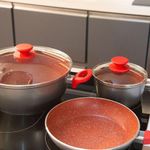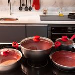 Conjunto De Panelas Philco Redstone PKT407 4 PeçasO Conjunto de Panelas Philco Redstone PKT407, composto por 4 peças, se destaca pelo revestimento cerâmico de alto poder antiaderente Redstone. Essa característica permite preparar alimentos sem grudar, tornando a limpeza mais fácil. Além disso, as panelas são versáteis e compatíveis com todos os tipos de fogões, como elétricos, a gás, radiante, indução e vitrocerâmicos. O cabo de baquelite, revestido com material emborrachado, proporciona segurança ao cozinhar, evitando queimaduras nas mãos. A espessura do fundo, de 4,5mm, contribui para uma distribuição mais eficiente e rápida do calor, mantendo a temperatura por mais tempo. Com espessura de 3,5mm, as panelas garantem durabilidade excepcional ao produto. Experimente a qualidade e praticidade do Conjunto de Panelas Philco Redstone PKT407 em sua cozinha. Cabo de baquelite emborrachado resistente ao calor Material base da Panela em Alumínio Revestimento antiaderente “Redstone” Revestimento antiaderente livre de agentes tóxicos Pode ser utilizado em queimadores elétricos, a gás, radiante, indução e vitrocerâmicos Inserto metálico no fundo da panela para contato em fogão/cooktops de indução Panela com fundo de 4,5 mm para distribuir e manter a temperatura Garantia de 90 dias contra defeitos de fabricação. PANELA PPH160APR REDSTONE 1,4L Diâmetro de 16 cm Volume de 1,4 litros. FRIGIDEIRA PPH240AFR REDSTONE 1,7L Diâmetro de 24 cm Volume de 1,7 litros. PANELA PPH240APR REDSTONE 2,7L Diâmetro de 24 cm Volume de 2,7 litros. PANELA PPH280ACR REDSTONE 6,1L Diâmetro de 28 cm Volume de 6,1 litros.