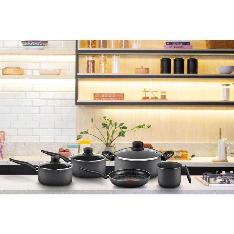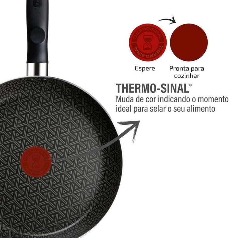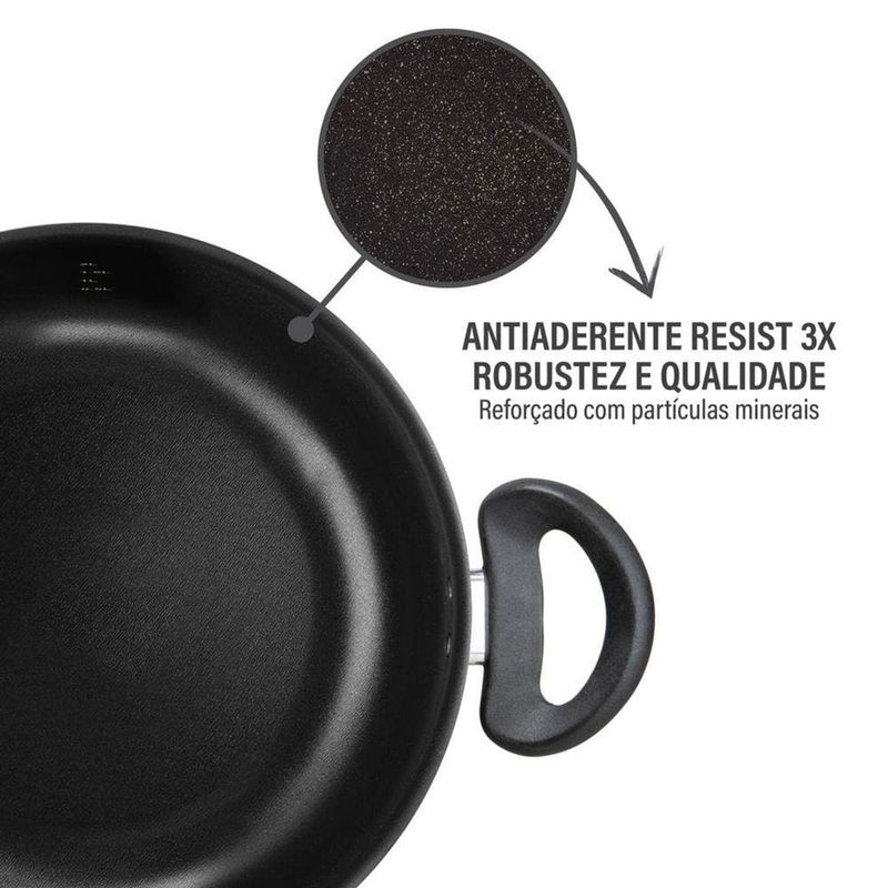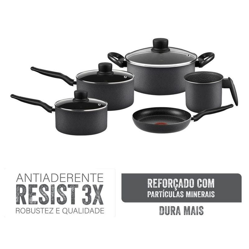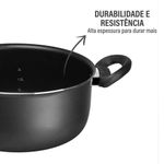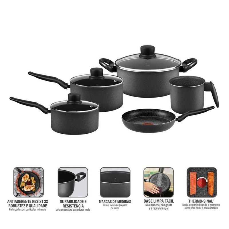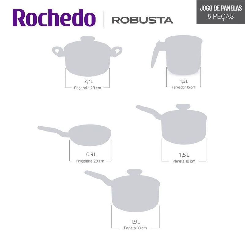 Robustez, praticidade e qualidade em cada detalhe do Conjunto de Panelas Rochedo Robusta Grafite 5 Peças, tudo o que você precisa para turbinar o preparo das refeições do dia a dia.Com revestimento interno antiaderente Resist 3X, reforçado com partículas minerais, as peças oferecem mais resistência e longa vida útil. A alta espessura da estrutura garante distribuição uniforme do calor, enquanto a base limpa fácil evita manchas e facilita a higienização.Além disso, conta com a tecnologia Thermo-Sinal®, que muda de cor indicando o momento ideal de selar os alimentos, e marcas de medidas internas para mais precisão nas receitas. A tampa de vidro temperado com saída de vapor proporciona segurança e controle no cozimento.Antiaderente Resist 3X: mais durabilidade e desempenhoThermo-Sinal®: sinaliza o ponto ideal para cozinharTampas em vidro temperado com saída de vaporCompatível com fogões a gás, vitrocerâmico e elétricoTodos os itens são livres de PFOA e podem ser levados à lava-louças, combinando segurança e praticidade para facilitar sua rotina. Com design clássico e funcional, é a escolha ideal para cozinhas modernas e completas.