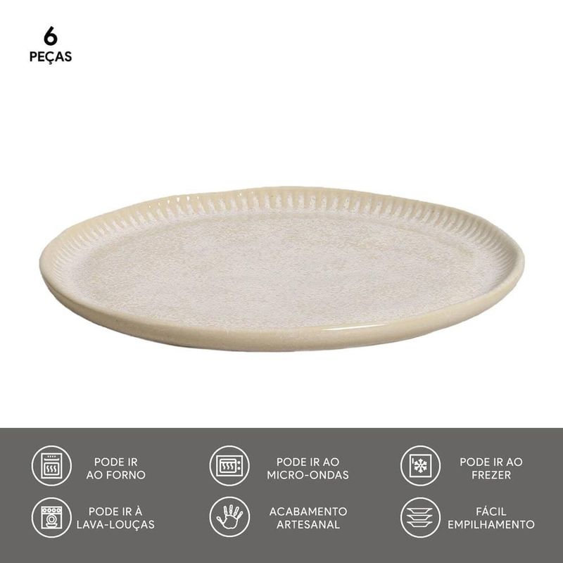 Beleza e Funcionalidade à Mesa Composto por 6 peças, o Conjunto de Pratos Para Sobremesa Porto Brasil adicionam charme à mesa. Pertencentes ao estilo Linhas, as peças do jogo apresentam um design atemporal, com detalhes de traços em destaque nas bordas.Beleza Autêntica em Cada Detalhe Os pratos Porto Brasil são desenvolvidos em Stoneware, um material inovador e sustentável que confere características únicas a cada peça. Além disso, contam com acabamento em esmalte, que proporcionam maior durabilidade. Adicione Facilidade a Sua Rotina Estes pratos de sobremesa são seguros e práticos, podendo ser utilizados na lava-louças, micro-ondas, freezer e geladeira, trazendo mais conforto para o seu dia a dia!
