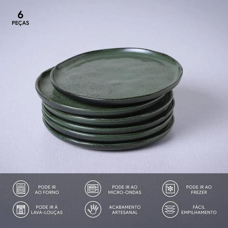 Um toque de frescor e requinte para a sua mesa O conjunto de pratos para pão Bio Greenery da Porto Brasil é a escolha ideal para quem deseja trazer vivacidade e frescor ao momento das refeições. Com um tom de verde vibrante inspirado na exuberância da natureza, seu design une elegância e modernidade, destacando-se pela textura levemente rústica e acabamento fosco. Suas refeições mais acolhedoras e sofisticadas Fabricado em Stoneware, um material cerâmico de alta qualidade, o conjunto combina resistência, durabilidade e beleza natural, sendo perfeito para servir pães, queijos, frios e até pequenas porções de sobremesas. Além do charme único, o conjunto é extremamente funcional e sustentável. Resistente a altas temperaturas, as peças podem ser utilizadas no forno, micro-ondas e freezer, proporcionando praticidade para o dia a dia.