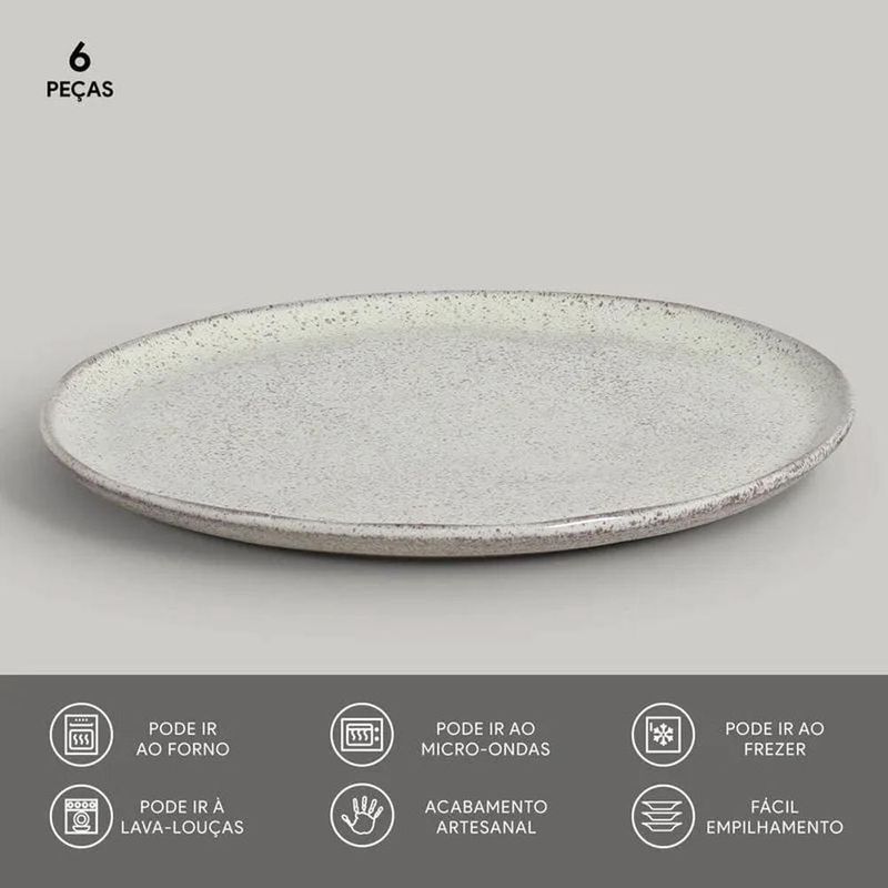 Sofisticação e sustentabilidadeO Conjunto de Pratos Rasos Porto Brasil Bio Pistache Verde Menta 29cm é uma escolha perfeita para quem busca sofisticação e sustentabilidade em sua mesa. Produzidos em stoneware, um material cerâmico inovador e sustentável, esses pratos possuem alta resistência mecânica e térmica, garantindo durabilidade e funcionalidade. Seu design exclusivo, com variações de formas, cores e relevos, confere um toque único e artesanal a cada peça, refletindo um acabamento manual cuidadoso que assegura a originalidade de cada prato.Qualidade e resistência excepcionaisCada prato deste conjunto passa por um rigoroso processo de queima, o que garante que eles atendam às principais normas mundiais de qualidade e resistência. A alta resistência térmica e mecânica das peças permite que sejam usadas de forma prática e segura em diversas situações, como em forno, micro-ondas e freezer. No entanto, é importante evitar mudanças térmicas bruscas para assegurar a integridade do material e prolongar a vida útil do conjunto.Versatilidade e cuidado no usoO conjunto de pratos Porto Brasil Bio Pistache Verde Menta é ideal para quem deseja praticidade e estética. Além de sua beleza e originalidade, são altamente versáteis, adequados para diferentes ocasiões e tipos de alimentos. Para garantir a longevidade das peças, é fundamental seguir as recomendações de uso, como evitar mudanças de temperatura abruptas, protegendo assim a qualidade e a aparência do conjunto ao longo do tempo.
