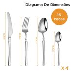 Possui 16 peças em aço inoxidável, dimensões variadas (faca 22,9 cm, garfo 20,2 cm), compatível com lava-louças. Inclui 4 tipos de talheres (jantar e chá), material resistente, uso para 4 pessoas em ambientes diversos. Dimensões específicas por peça (colher 20,3 cm, chá 15,5 cm), apto para lavagem em máquina. Design monobloco sem junções, adequado para ocasiões familiares, restaurantes e piqueniques. ESPECIFICAÇÕES TÉCNICAS - Nome do produto: Conjunto de Louças 16 Peças KA-5510 - Categoria: Casa > Utensílios de Cozinha > Talheres - Material principal: Aço inoxidável - Dimensões (A × Ø): 22,9 cm- Itens inclusos: 4 garfos de jantar, 4 facas de jantar, 4 colheres de jantar, 4 colheres de chá - Uso recomendado: Para 4 pessoas, ambientes secos (família, restaurantes, eventos) - 16 peças em aço inoxidável - Dimensões: faca 22,9 cm, garfo 20,2 cm, colher 20,3 cm, colher de chá 15,5 cm - Apto para lava-louças: Sim - Embalagem: caixa - Não descartável - Kit de fábrica para 4 pessoas Conteúdo da Embalagem - 4 garfos de jantar - 4 facas de jantar - 4 colheres de jantar - 4 colheres de chá - Caixa de embalagem Conjunto de talheres em aço inoxidável com 16 peças, ideal para 4 pessoas. Compatibilidade com lava-louças garantem versatilidade em ambientes domésticos e sociais. Uso e Limitações - Ambientes permitidos: interior, exterior, piqueniques, restaurantes e eventos sociais. - Restrições: não recomendado para contato prolongado com líquidos quentes ou altamente ácidos. - Compatibilidade real: uso em superfícies secas, não apto para micro-ondas.