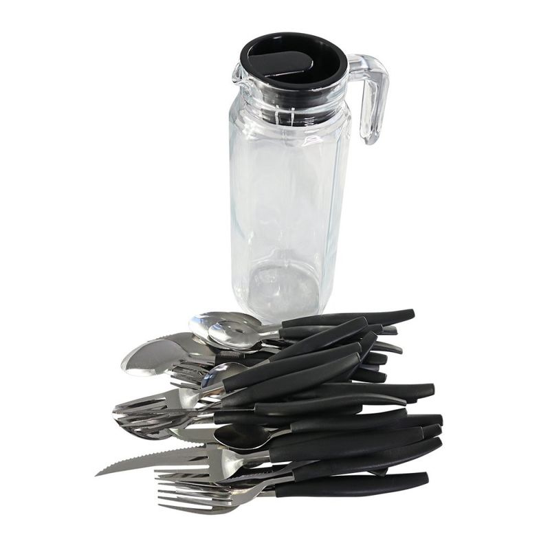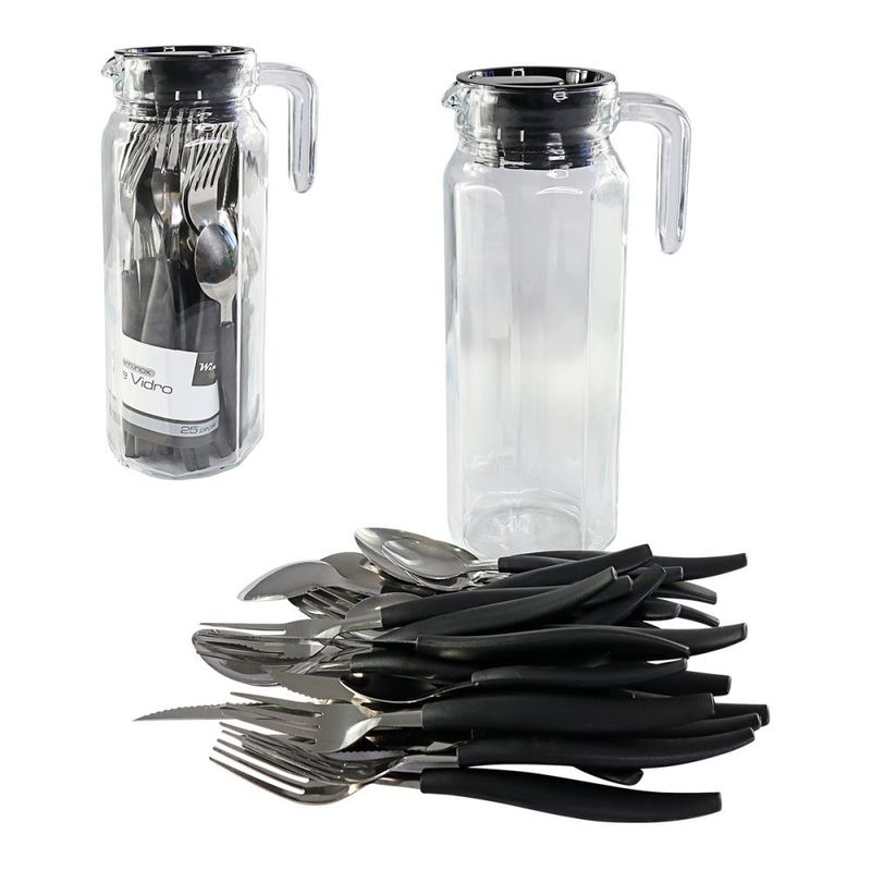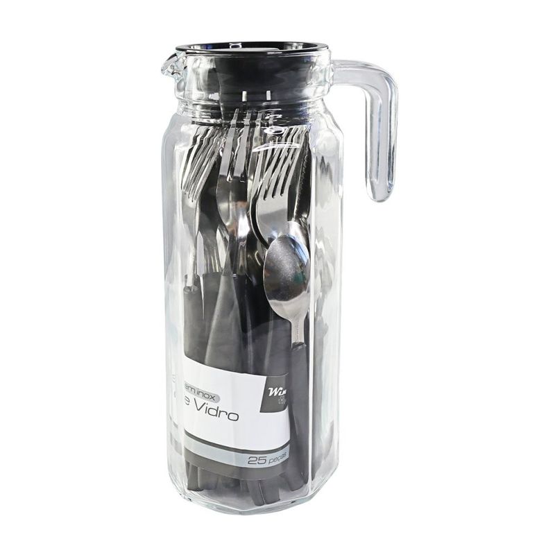 Conjunto de Talheres Preto com 24 Peças com Jarra de Vidro ============================================================ A combinação perfeita de elegância, funcionalidade e praticidade, esse conjunto com talheres e jarra de vidro será a escolha perfeita para a sua cozinha! Com design sofisticado, esse conjunto completo é perfeito para as refeições em família, jantares sofisticados ou até mesmo para o uso diário. Design clássico e ergonômico, adicionando sofisticação à sua mesa, proporcionando tudo que precisa para servir suas refeições. Acompanhando os talheres, a jarra de vidro perfeita para servir sucos, coquetéis ou qualquer outra bebida que deseje, com visual minimalista, se adapta à qualquer tipo de cozinha. ============================================================ Contém: 01 Jarra de Vidro 06 Garfos 06 Facas 06 Colheres 06 Colheres de Chá Especificações: - Material: Polipropileno, Inox e Vidro - Medida Jarra: 24,5cm x 8,5cm - Medida Colher: 19,5cm de comprimento (cada) - Medida Colher de Chá: 15cm de comprimento (cada) - Medida Garfo: 20cm de comprimento (cada) - Medida Faca: 15cm de comprimento (cada) - Capacidade: 01 Litro - Peso: 1100 gramas - Cor: Preto ============================================================ Devido à diferença entre monitores e iluminação diferentes, pode haver variação na tonalidade apresentada no anúncio. Medidas muito aproximadas.