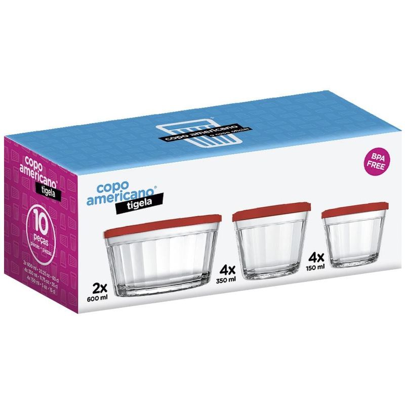 Qualidade e modernidade na sua cozinha.O Conjunto de Tigelas da marca Copo Americano contém 10 peças em vidro muito versáteis e com design exclusivo. São ideais para armazenar os alimentos que desejar mantendo a textura e o sabor por mais tempo. As tampas exclusivas oferecem um encaixe perfeito para que você possa guardar com segurança e praticidade. Podem ir ao micro-ondas, geladeira e lava-louças.