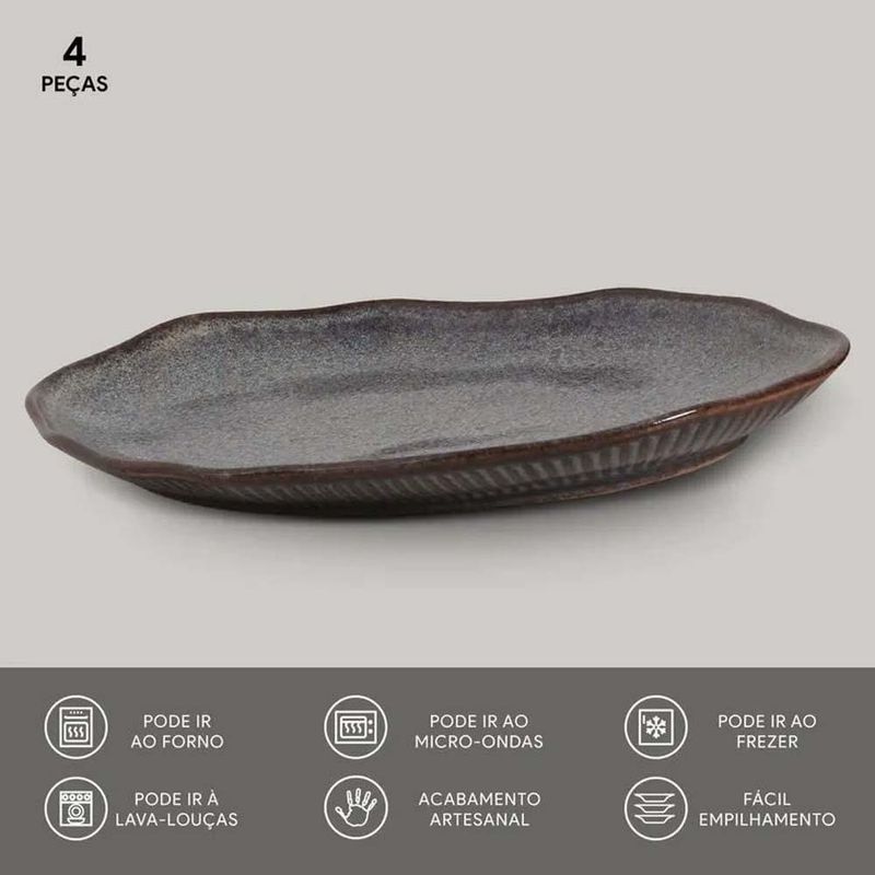 Modernidade e sofisticação na medida certaO conjunto de travessas ovais da linha Bio Titanium, da Porto Brasil, é a escolha ideal para quem deseja incorporar um toque contemporâneo e industrial à sua mesa. Com acabamento metálico que remete ao aço escovado, essas peças aliam modernidade e elegância em um design clean e funcional. O formato oval com bordas suavemente arredondadas, combinado ao acabamento texturizado, oferece sofisticação com um toque de inovação.Estilo e versatilidade em harmonia Feitas em Stoneware, um material cerâmico de alta qualidade, essas travessas são resistentes e práticas, podendo ser usadas em forno, micro-ondas e freezer. Composto por 4 peças, esse conjunto é perfeito para servir desde saladas até sobremesas, complementando sua mesa com versatilidade e charme, agregando estilo a qualquer refeição.