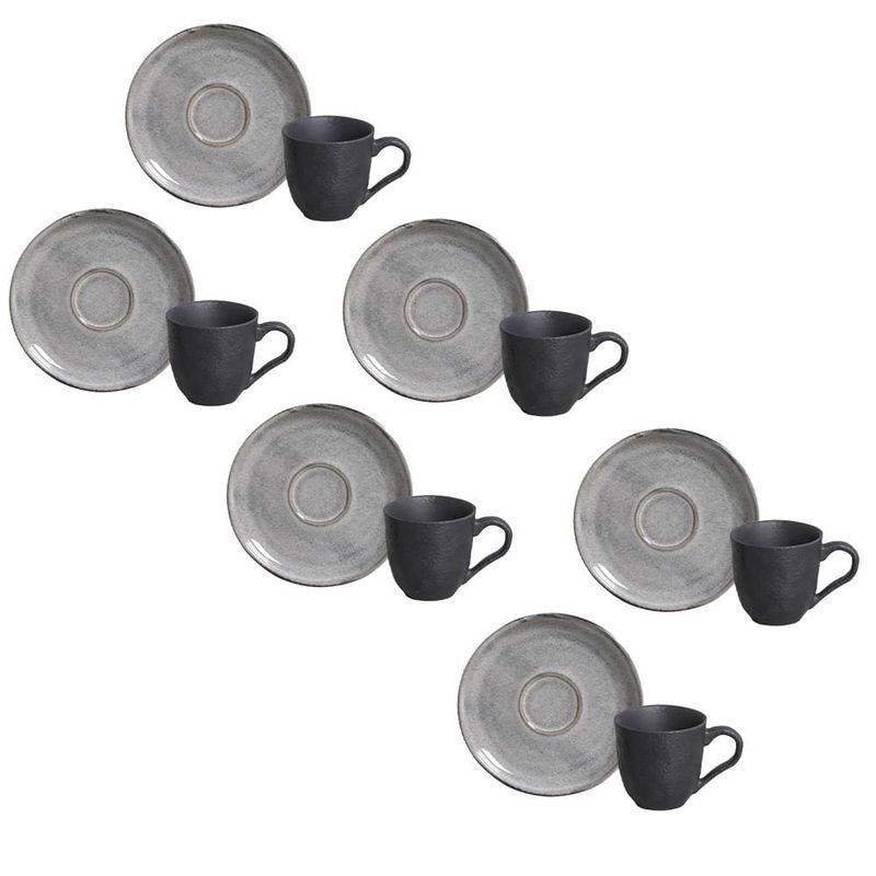 Estilo urbano e sofisticação na sua mesaO conjunto de xícaras de café com pires Porto Brasil Bio Dust é a expressão perfeita do design industrial aplicado à mesa. Com uma estética que une elementos rústicos e urbanos, suas peças em Stoneware oferecem um visual moderno e cheio de personalidade. A base em tom preto, combinada com texturas marcantes, cria um contraste elegante e atemporal, ideal para quem valoriza sofisticação com um toque arrojado.Praticidade e sustentabilidade no dia a diaCom capacidade de 120ml, as xícaras e pires podem ser usados no micro-ondas, lava-louças e freezer, facilitando o cotidiano. Além de sua beleza singular, o conjunto alia funcionalidade à responsabilidade ambiental: as peças são produzidas com matérias-primas naturais e processos sustentáveis pela Porto Brasil, sendo perfeitas para quem busca estilo, durabilidade e um impacto ambiental reduzido.