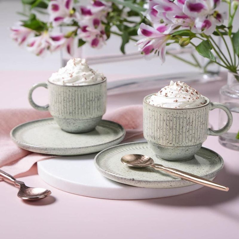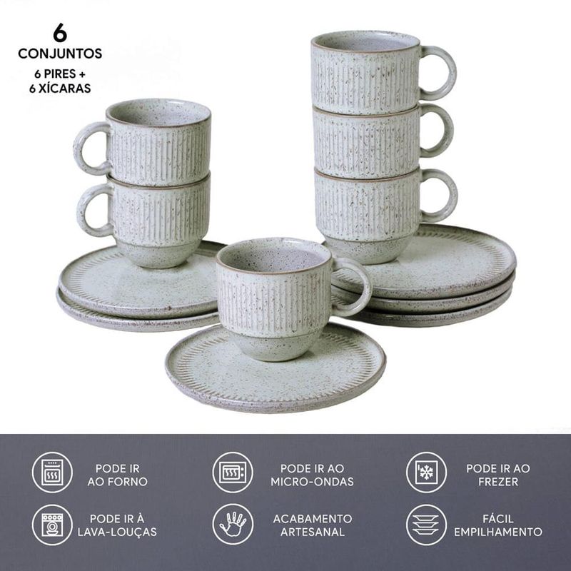 Saboreie Sua Bebida Com Tranquilidade O chá transcende o simples ato de beber, alguns sabores possuem propriedades terapêuticas, ajudam a acalmar e a aquecer durante os dias frios. Tendo isso em mente, a Porto Brasil criou conjuntos de xícaras e pires para que você desfrute do seu chá favorito. Design Clássico e Único Cada peça deste conjunto apresenta um acabamento feito à mão, adicionando um toque de sofisticação à sua mesa. Além disso, as xícaras foram projetadas para facilitar o empilhamento, otimizando o espaço da sua cozinha. Qualidade Notável e Acabamento Artesanal Produzidas em Stoneware, essas peças são confeccionadas com os melhores materiais naturais, passando por um processo de queima e acabamento manual exclusivo. Isso resulta em produtos de excelência, notavelmente mais duráveis. Desfrute de Momentos Memoráveis Este conjunto de 6 xícaras de 230ml acompanhadas por 6 pires proporciona praticidade ao servir chá para os seus convidados. Com os produtos da Porto Brasil, seus momentos à mesa serão ainda mais agradáveis e memoráveis.