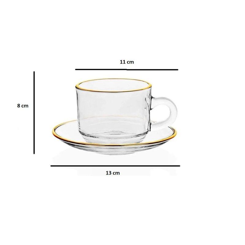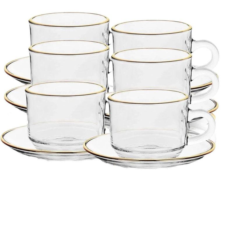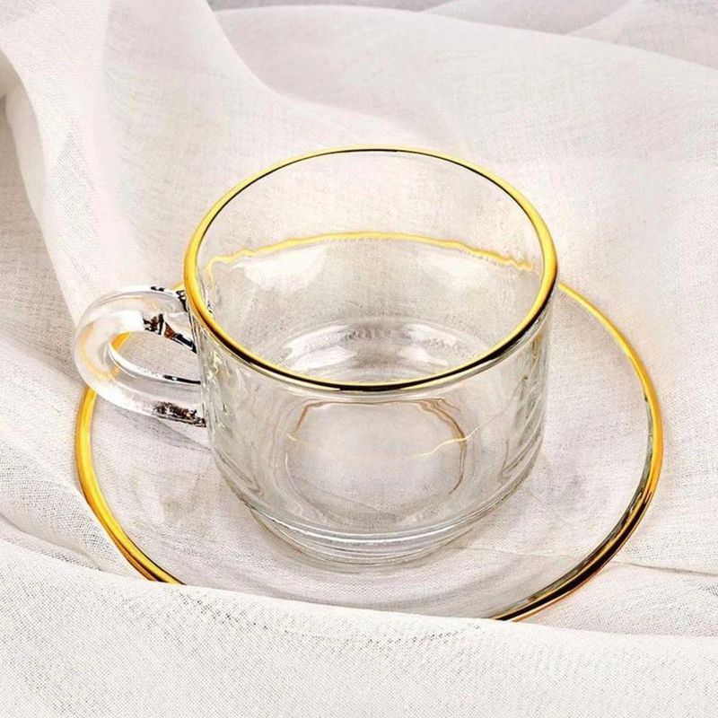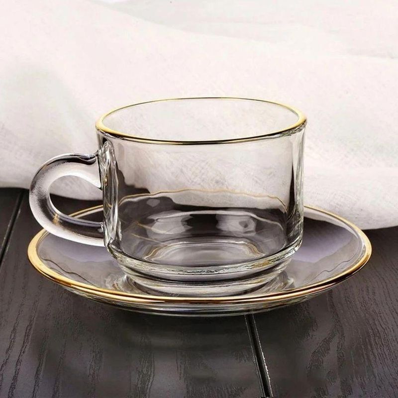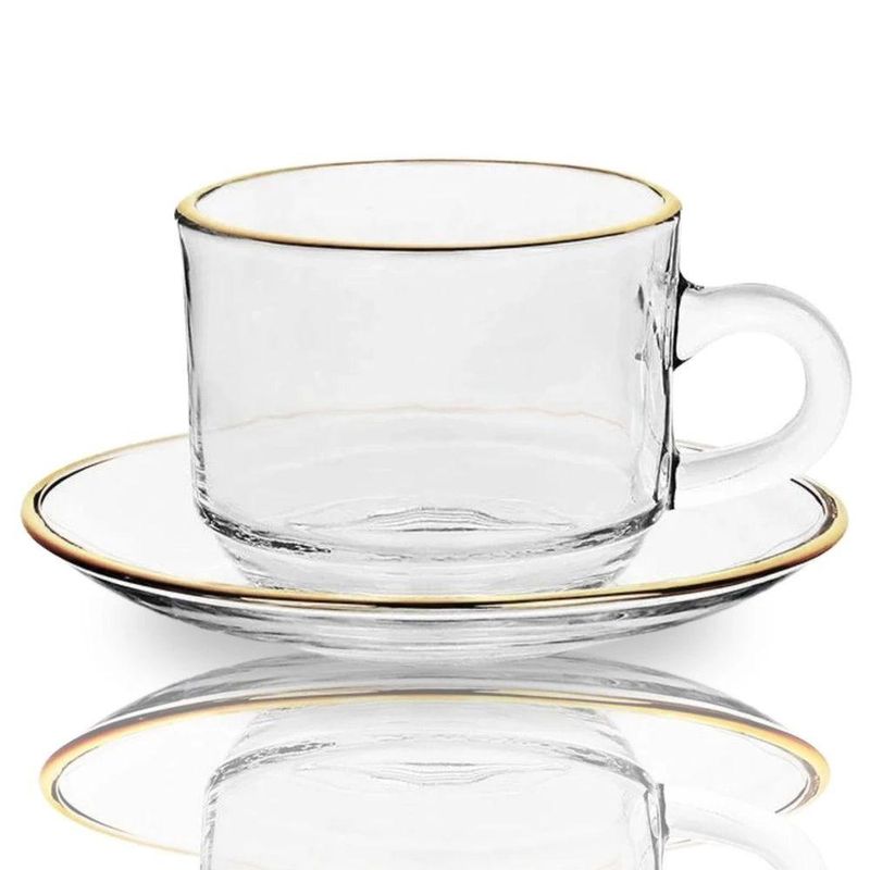 Seja bem-vindo(a) a Loja NIVALMIX,Eleve a sua experiência de servir e degustar com o sofisticado Conjunto de Xícaras de Vidro com Borda Dourada da Quanhe. Composto por 12 peças, sendo 6 xícaras de vidro de 200ml e 6 pires, todas com borda dourada, este conjunto traz elegância e requinte para qualquer ocasião.Feitas com vidro de alta qualidade, as xícaras têm a medida perfeita para cafés, chás e outras bebidas, oferecendo um toque delicado e moderno à sua mesa. A borda dourada adiciona um charme especial, tornando cada gole ainda mais prazeroso. Os pires acompanham as xícaras, oferecendo praticidade e beleza ao servir.Ideal para momentos especiais, recepções ou até mesmo para o dia a dia, esse conjunto traz um equilíbrio perfeito entre funcionalidade e estética, transformando qualquer ambiente em um espaço acolhedor e elegante.Adicione um toque de sofisticação à sua mesa com o Conjunto de Xícaras de Vidro com Borda Dourada, da Quanhe. Perfeito para quem aprecia a combinação de beleza, praticidade e qualidade.Especificações:• Marca: Quanhe• Referência: N2444409• Dimensões: 13 cm x 11 cm x 8 cm (CxLxA)• Peso: 210 gr (1 pires + 1 xícara)• Capacidade: 200 ml• Material: Vidro temperado• Garantia do Fabricante: 03 meses contra defeitos de fabricação• Validade: IndeterminadaItens Inclusos:• Conjunto 6 xícaras e 6 pires de vidro*As cores podem variar entre as imagens mostradas acima e o produto. Imagens meramente ilustrativas.