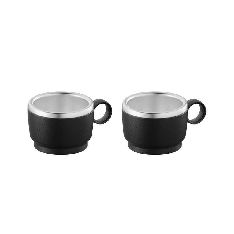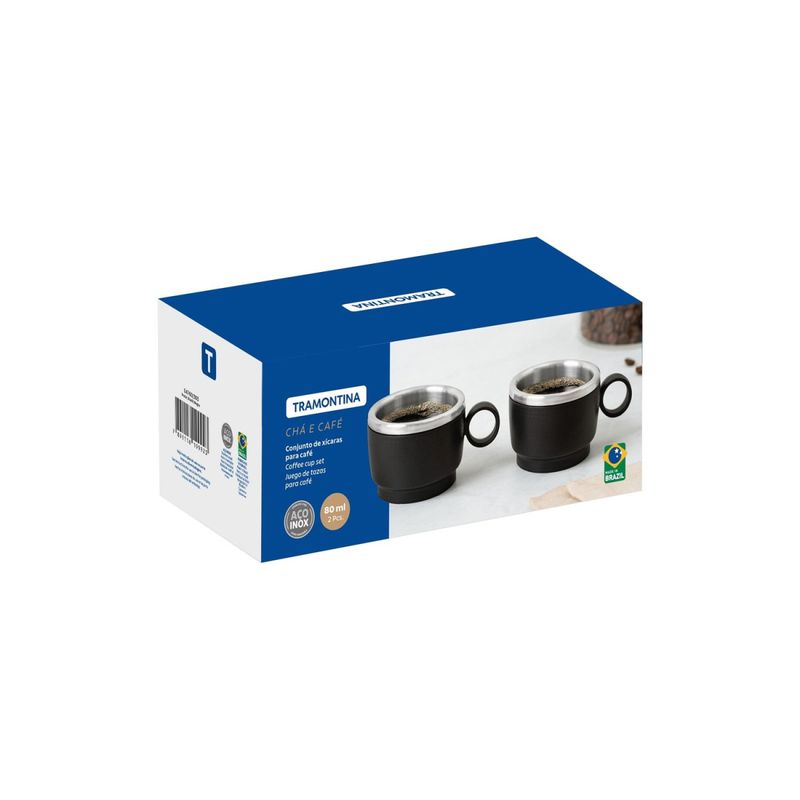 Conjunto de Xícaras para Café Tramontina Empilháveis em Aço Inox Preto e Alça Redonda 2 Peças 80 ml Tramontina - Conjunto de XÃcaras para Café Tramontina Empilháveis em Aço Inox Preto e Alça Redonda 2 Peças 80 ml O café de todos os dias com um toque de design e praticidade. O Conjunto de XÃcaras para Café Tramontina Empilháveis em Aço Inox com Revestimento em ABS Preto e Alça Redonda 2 Peças 80 ml é ideal para quem busca funcionalidade sem abrir mão da estética. As xÃcaras possuem interior em aço inox, que garante higiene e conservação térmica, e revestimento externo em ABS preto com textura elegante. A alça redonda oferece ergonomia e um visual diferenciado, tornando o momento do café ainda mais especial. Com design empilhável, são práticas para armazenar e perfeitas para compor ambientes modernos. Contém: 2 xÃcaras para caféCapacidade: 80 ml cadaInterior em aço inoxRevestimento externo em ABS preto com textura foscaAlça redonda anatômica e confortávelDesign empilhávelAcabamento interno brilhanteProduto leve, resistente e de fácil limpeza Cuidados com o produto Lave o produto antes do primeiro uso. A parede interna em aço inoxidável garante durabilidade, é fácil de higienizar, segura para contato com bebidas e não altera o sabor, proporcionando uma experiência mais agradável. A parede externa em ABS texturizado oferece um toque refinado e evita o aquecimento externo da xÃcara, permitindo manuseio confortável. Evite o contato do produto com superfÃcies muito quentes para preservar a integridade dos materiais. Lave com sabão neutro ou detergente e uma esponja macia. Enxágue bem após a lavagem para remover completamente os resÃduos de produtos de limpeza. Seque imediatamente após a lavagem para evitar manchas causadas por substâncias quÃmicas da água, como o cloro. Não armazene o produto em locais úmidos, pois a umidade também pode causar manchas. Evite quedas ou impactos, pois podem danificar a estrutura da xÃcara, especialmente a parede externa. Garantia 90 dias de garantia legal para vÃcios ou defeitos de fabricação. - - Características Gerais do Produto: Garantia: • 3 Meses