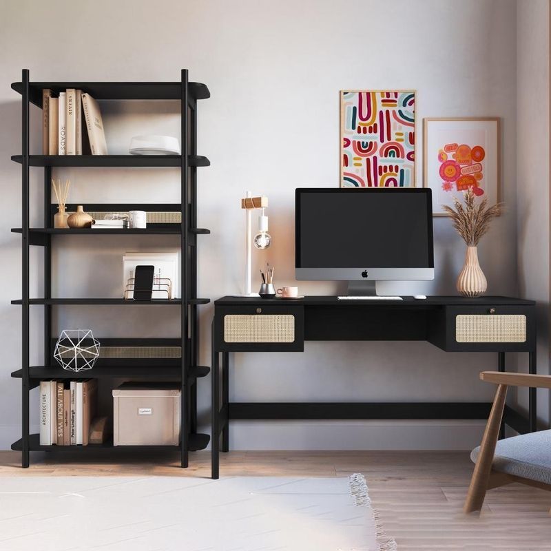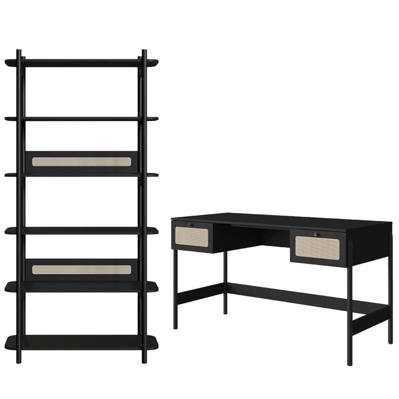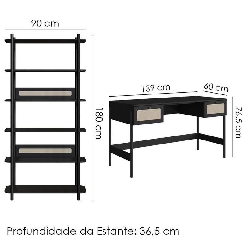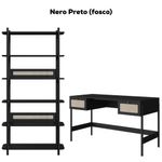 Conjunto Estante E Escrivaninha Pes Madeira 27974 Nero Preto ArtesanoConjunto Estante Livreiro e Escrivaninha 27974, ideal para levar personalidade e design moderno ao seu lar. Estrutura em MDP com acabamento BP, composto por estante com 6 prateleiras funcionais e cantos arredondados, fundo em MDF 3 mm, gavetas com corrediças metálicas e detalhes em aplique de tela sintética (PVC) imitando palhinha. Possui puxadores em poliestireno na cor dourada, travessa inferior em MDP, longarina metálica antiempenamento e pés em madeira maciça (eucalipto). Produto entregue em 02 volumes.Dimensões:Estante 27965 - Altura: 180 cm | Largura: 90 cm | Profundidade: 36,5 cmEscrivaninha 27931 - Altura: 76,5 cm | Largura: 139 cm | Profundidade: 60 cmEspecificações Técnicas:Modelo: 27974Materiais: MDP, MDF, Metal e Madeira MaciçaEstilo: ModernoPeso máximo suportado: 49 kgSistema de Montagem:ParafusosManual de montagem inclusoMontagem, desmontagem e instalações são de responsabilidade do clienteRecomendação de Limpeza:Utilize pano seco para retirada do póEvite produtos abrasivos e contato direto com a umidadeElegância e funcionalidade em perfeita harmonia para seu lar.Importante Saber:Imagens meramente ilustrativas, não acompanham objetos de decoração ou eletrônicosA tonalidade pode variar conforme iluminação, monitor ou percepção visualConfira a quantidade de volumes e as condições da embalagem; em caso de avarias, não assine e recuse a mercadoriaNão nos responsabilizamos por transporte em escadas, elevadores ou guincho; custos adicionais são de responsabilidade do compradorVerifique se as dimensões do produto passam normalmente por portas, elevadores, escadas ou corredoresRecomendamos que o responsável pelo recebimento confira se os produtos entregues correspondem ao modelo e à quantidade adquiridaGarantia de Fábrica:90 dias para defeitos de fabricação NA Cor: Nero Preto
