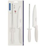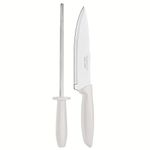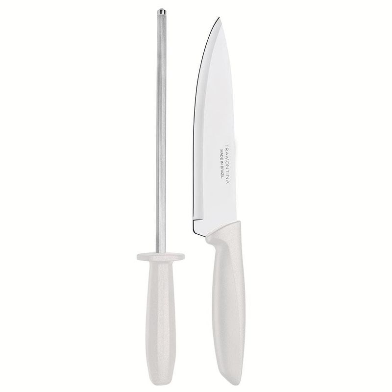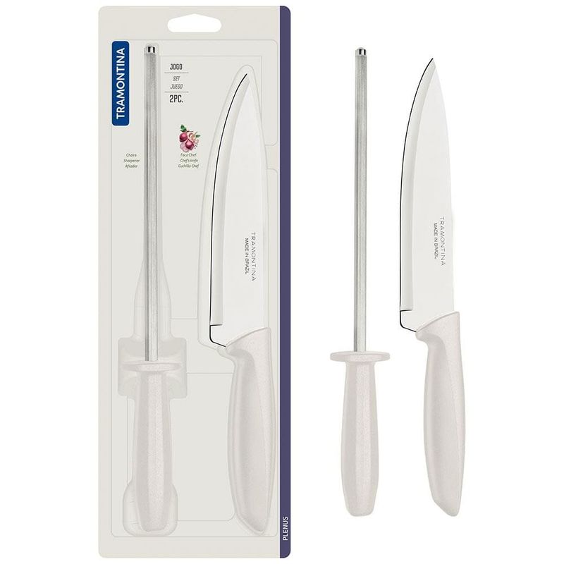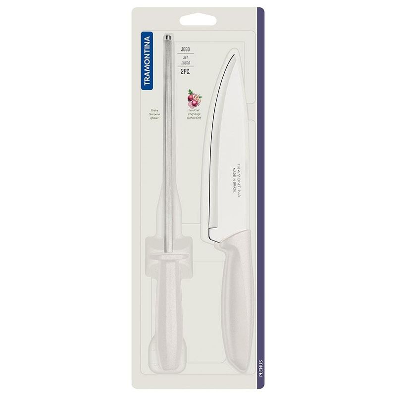 Quem ama cozinhar sabe que o preparo dos alimentos é feito por etapas, e ter em mãos utensílios específicos que possam facilitar esse processo, é indispensável. Por conta disso, esse excelente Conjunto Faca Chef e Chaira Plenus da Tramontina é perfeito!A Faca Chef que compõe esse kit é essencial para diferentes funções em sua cozinha, garantindo mais eficiência em cortar, fatiar e picar os mais variados tipos de alimentos, desde peixe, frango, carnes bovina e suína, até frutas, legumes e verduras.Já a Chaira é perfeita para manter o fio de corte e afiar diferentes tipos de facas.Ambas as peças são fabricadas em Aço Inoxidável super eficiente e de alta durabilidade, garantindo um manuseio preciso e seguro. Os cabos são fabricados em Polipropileno e são confortáveis para encaixar perfeitamente nas mãos, além de serem leves e fáceis de utilizar.Garanta agora mesmo mais praticidade para sua cozinha com a Tramontina!