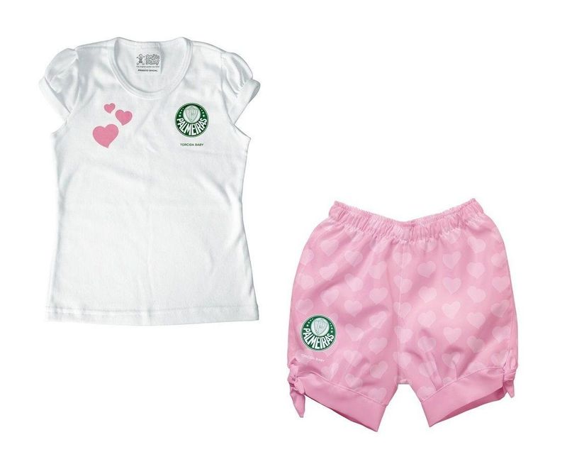 Conjunto Infantil Palmeiras Rosa Oficial Torcida Baby Conjunto do Palmeiras Oficial, licenciado. Composto por uma camiseta branca, com estampa de corações rosas e o escudo do Palmeiras e um shorts rosa com o escudo do Palmeiras na parte frontal. Com esse lindo conjunto do Palmeiras você poderá vestir o seu bebê dos pés a cabeça, com as cores do Verdão, com muito charme e elegância. Características - Kit com 2 peças para meninas. - Com o brasão do time. Especificações Técnicas Material: Camiseta 70% algodão 30% poliéster, Shorts 100% poliéster Idade Recomendada: Tamanho P (indicado para 0-3 meses): COMPRIMENTO 28 cm / LARGURA 27 cm Tamanho M (indicado para 3-6 meses): COMPRIMENTO 29 cm / LARGURA 28 cm Tamanho G (indicado para 6-9 meses): COMPRIMENTO 30 cm / LARGURA 29 cm Tamanho GG (indicado para 9-12 meses): COMPRIMENTO 31 cm / LARGURA 30 cm Tamanho 2 anos:: COMPRIMENTO 42 cm / LARGURA 36 cm Tamanho 4 anos:: COMPRIMENTO 45 cm / LARGURA 38 cm Tamanho 6 anos:: COMPRIMENTO 51 cm / LARGURA 42 cm Conteúdo da Embalagem: 1 Camiseta, 1 Shorts Recomendações de uso: Este artigo é composto por mais de uma cor. Ao lavar, não deixe de molho, não use alvejante, nem excesso de sabão e centrifugue ou torça muito bem. Produto Oficial Licenciado.