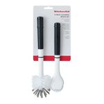 Facilite a lavagem da louça com o conjunto de 2 escovas de limpeza da KitchenAid. Inclui uma escova para garrafas e uma escova de limpeza oval com um raspador embutido para remover alimentos presos. Cada uma dessas escovas é feita de materiais sem BPA com cerdas macias de naylon que resistem ao uso diário. Cada uma foi projetada com alças antiderrapantes para maximizar o controle e o conforto durante o uso. Adequado para uso em todos os utensílios de cozinha, inclusive antiaderentes, e também pode ser lavado na máquina de lavar louça. Inclui um pincel de cabeça oval e um pincel para garrafas. O pincel de cabeça oval possui um raspador embutido.A escova para garrafas tem um gargalo fino para limpar garrafas e potes sem esforço. - Especificações: • Material: Polipropileno livre de BPA, silicone e cerdas de Nylon • Medidas Escova maior: Altura: 30cm / Largura: 8cm / Peso: 90g• Medidas Escova menor: Altura: 26cm / Largura: 6cm / Profundidade: 8cm / Peso: 85g• Cor: Preto e branco