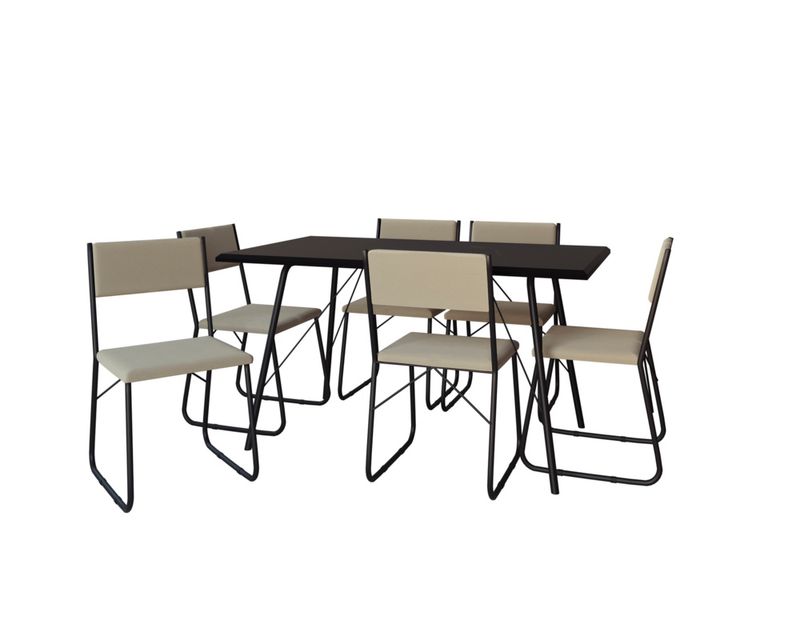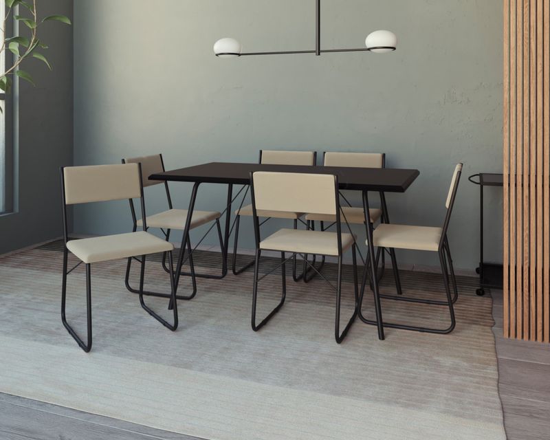Conjunto Mesa Paraty Preta Com Tampo Preto 150 Cm 6 Cadeiras Angra Preto Com Assento Bege