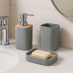 Seja bem-vindo(a) a Loja NIVALMIX, Transforme seu banheiro em um ambiente organizado e cheio de estilo. O Conjunto Quanhe 3 Peças é perfeito para quem busca um toque sofisticado sem abrir mão da praticidade. Ideal para presentear ou renovar sua bancada com elegância e funcionalidade. O conjunto traz três peças essenciais: um porta-sabonete líquido, um porta-escovas e uma saboneteira, garantindo tudo o que você precisa para organizar sua rotina de higiene. O estilo minimalista em tons neutros, harmoniza com diferentes estilos decorativos, do mais moderno ao clássico. Mantenha seu ambiente mais clean e sofisticado, com conjunto de banheiro da Quanhe. Especificações • Marca: Quanhe • Referência: 2488037 • Cor: Cinza• Materiais: Plástico e madeira • Garantia do Fornecedor: 03 meses contra defeitos de fabricação • Validade: Indeterminada Itens Inclusos: • Porta Sabonete Líquido (Medidas aproximadas: 17 x 7 cm ) • Porta- escovas (Medidas aproximadas: 11 x 7,5 cm ) • Saboneteira (Medidas aproximadas: 12,5 x 7,5 cm )