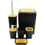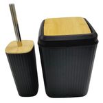 Seja bem-vindo(a) a Loja NIVALMIX,Este conjunto organizador de banheiro combina sofisticação e praticidade, trazendo um design moderno em preto com detalhes em bambu. Produzido em material resistente, é ideal para quem busca elegância sem abrir mão da funcionalidade no dia a dia. O kit é completo, composto por lixeira com tampa basculante, dispenser para sabonete líquido, porta-escovas de dente, copo multiuso, saboneteira com sistema de drenagem e escova sanitária com suporte discreto. Cada peça foi pensada para proporcionar organização, higiene e charme ao ambiente, criando um banheiro mais acolhedor e sofisticado. A combinação do preto com o bambu garante versatilidade para harmonizar com diferentes estilos de decoração, além de transmitir um toque natural e contemporâneo.Especificações• Marca: Quanhe • Referência: N248740-0• Cor: Preto • Material: Plástico e bambu• Quantidade de peças: 6 • Garantia do fabricante: 3 meses • Validade IndeterminadaItens Inclusos• 01 Lixeira - 8L • 01 Escova sanitária - 36x9x9cm • 01 Saboneteira - 8,5x2,5x11,5cm • 01 Porta Sabonete líquido - 380ml • 01 Copo multiuso - 380ml • 01 Porta escova - 10,5x7,5x7,5cm