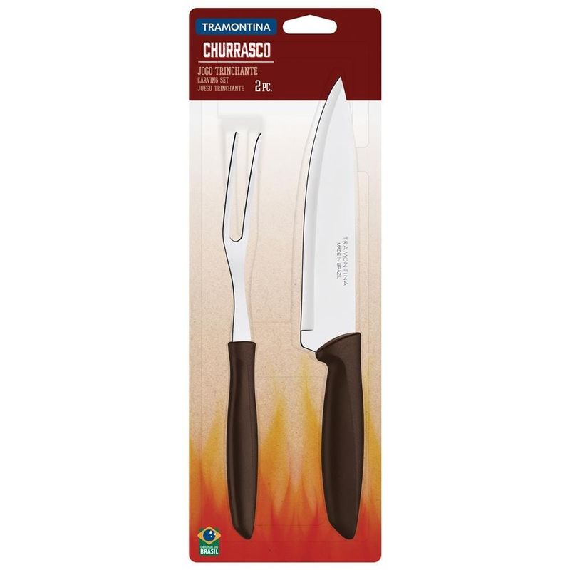 Na hora de servir aquela deliciosa carne assada em seus churrascos escolha os utensílios da Tramontina e faça bonito!O Jogo Trinchante Plenus possui 2 peças leves e de fácil manuseio, com lâminas produzidas em aço inox submetidas a tratamento térmico que oferecem maior durabilidade e resistência. Combinam com qualquer ambiente e ainda dão um toque especial, pois possuem cabos de polipropileno na cor marrom.