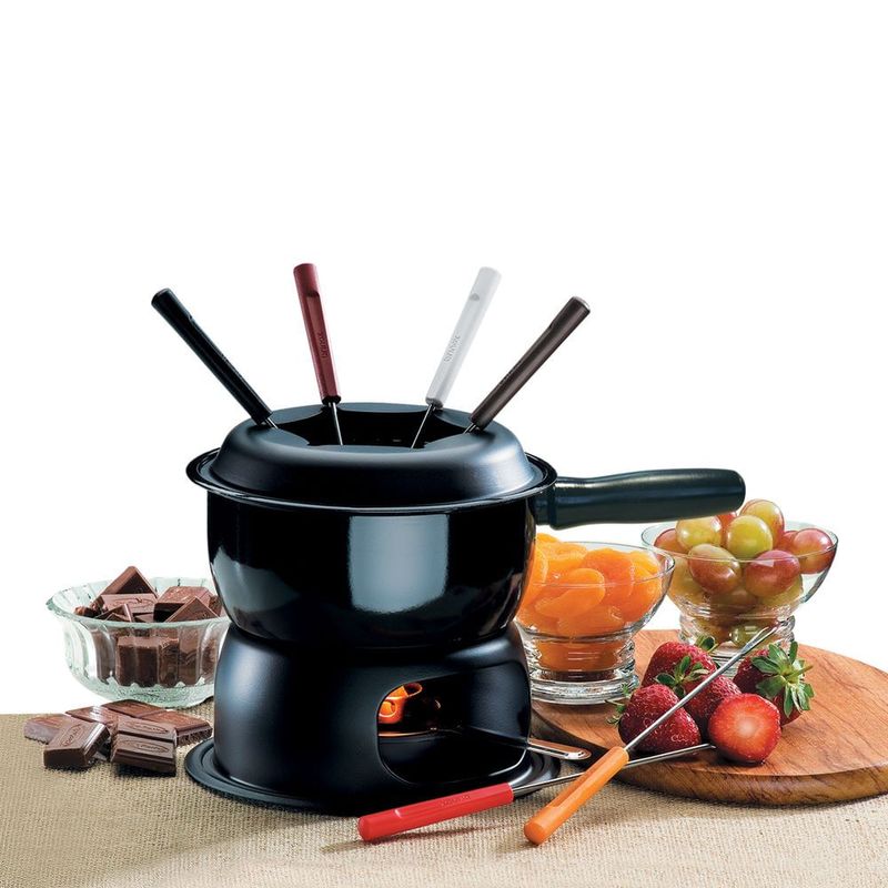 O Conjunto para Fondue tem Caçarola Esmaltada e é ideal para o preparo de Fondues de Queijo, Carne e Chocolate pois aquece menos e mantém os ingredientes na temperatura certa para não queimar. Dica: Para o Fondue de Carne é necessário manter a chama do fogareiro alta. A Caçarola tem cabo longo e capacidade para 1,25 Litros. Completo, vem com um Separador de Garfos, 1 Suporte Epóxi, 1 Fogareiro de Aço Inox, Menor e com Abafador e 1 Base Epóxi. Além disso, acompanha 6 Garfos com cabos coloridos. Faz das ocasiões mais que especiais! Garantia do produto: 90 dias de garantia de acordo com o Código de Defesa do Consumidor + a Garantia do Fabricante