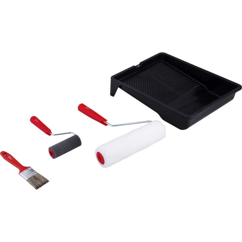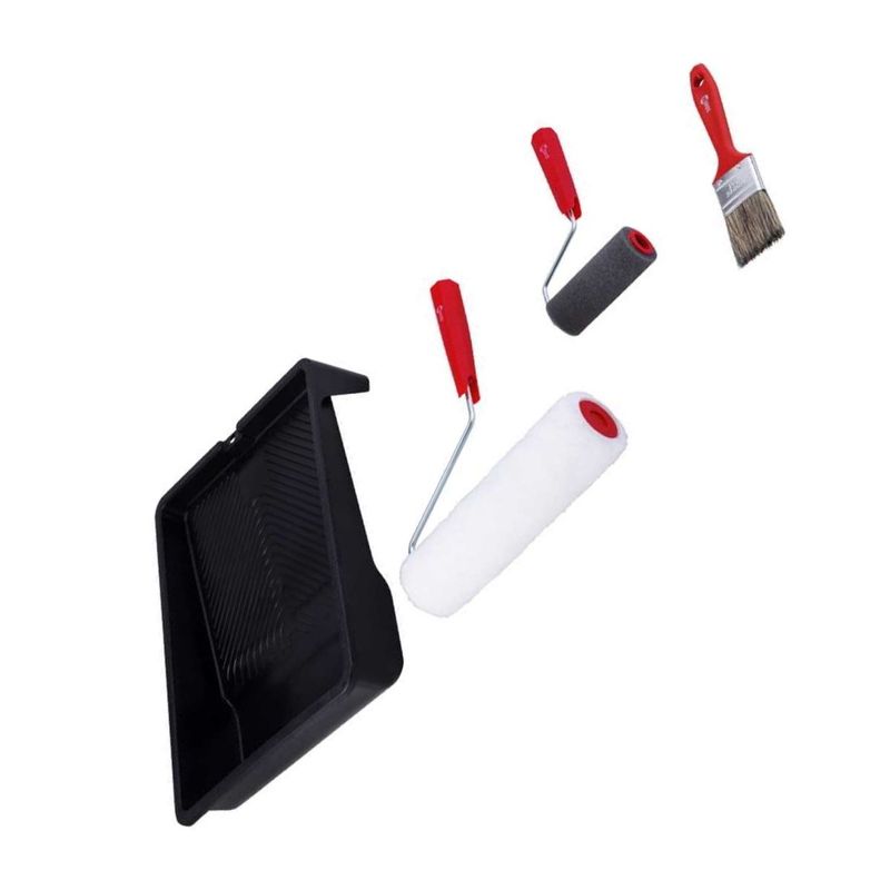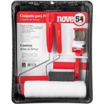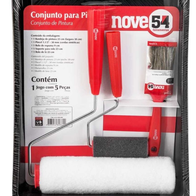 Código do Fornecedor: 6241005000Marca: Nove54Conteúdo da embalagem: 1 Conjunto Para Pintura 5 Peças Nove54Destaques e diferenciais: Evita respingos, proporcionando ótimo rendimento e acabamento.Aplicações e dicas de uso: Indicado para utilização em pinturas residenciais e pequenos reparos.Garantia legal: 90 diasDetalhes TécnicosQuantidade de peças do kit: 5 peças Largura do rolo para pintura: 23 cm (lã) / 9 cm (espuma) Composição (jogo): 1 bandeja de pintura 23 cm, 1 pincel 1.1/2", 1 rolo de espuma 9 cm, 1 suporte para rolo 23 cm e 1 rolo de lã 23 cm Cor da bandeja plástica para pintura: Preta Largura da bandeja plástica para pintura: 38 cm Material do rolo para pintura: Lã e Espuma Suporte do rolo para pintura: Com suportes Material das cerdas do pincel: Sintética Altura das cerdas do pincel: 44 mm Cor das cerdas do pincel: Gris Largura do pincel: 1.1/2" - 38 mm Cor do cabo do pincel: Vermelho Massa aproximada (peso) (kg): 0,460 kg