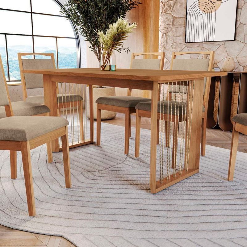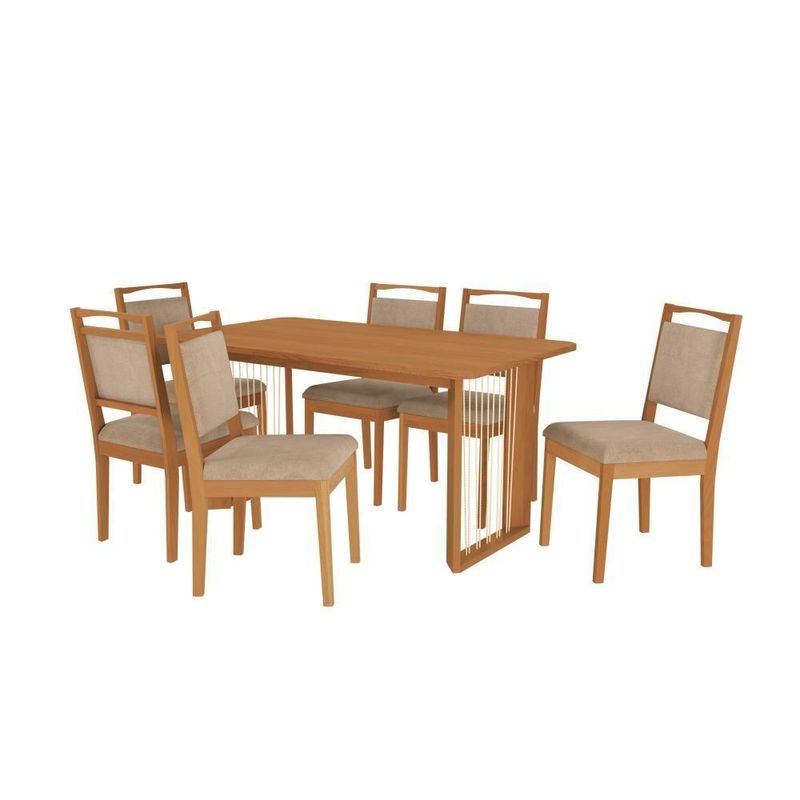 Conjunto Sala De Jantar Lina Em Madeira Maciça 6 Cadeiras Linho FendiPara quem busca por modernidade e estilo, o Conjunto CSJ348CA da Linha Sala de Jantar Premium Kappesberg vai conquistar o seu espaço. Com design moderno, a base é robusta e resistente, produzida em madeira de eucalipto, garante maior durabilidade, além de uma beleza única. Com formato retangular, o destaque fica para o detalhe das cordas nas laterais, proporcionando um acabamento leve e moderno.Medindo 76,5cm de altura, 134,5cm de largura e 59cm de profundidade, ela é perfeita para todos os ambientes, e quando combinada ao tampo retangular, acomoda até seis pessoas. Em MDP de 25mm, com robustez, firmeza e qualidade, o tampo possui as pontas retas, garantindo mais segurança e praticidade. Medindo 160cm x 90cm de profundidade, para completar o diferencial, a pintura é touch na cor canela, com a textura dos veios da madeira, garantindo a sensação de aconchego ao ambiente.Já as cadeiras que compõem o conjunto, no modelo Lina, também em madeira de eucalipto, são entregues montadas, suportando até 120kg e combinando com todos os momentos. Medindo 95cm de altura, sendo 50cm a altura do assento, 43,5cm de largura e 52,5cm de profundidade, para mais comodidade, ela possui assento e encosto estofados e recobertos com tecido linho fendi, o que garante um toque suave e gostoso, proporcionando conforto em todos os momentos.O destaque fica para o puxador em madeira na parte superior, que facilita o manuseio e evita sujar o tecido, garantindo um design e acabamento único para seu espaço, além de uma sala de jantar mais completa. Renove e transforme seu espaço com o Conjunto de Mesa da Sala de Jantar Premium Kappesberg.Medidas:- 83 cm de altura- 160 cm de largura- 90 cm de profundidadeItens inclusos:- Uma (1) mesa em Madeira Maciça- Seis (6) Cadeiras em Madeira Maciça- Estrutura em MDFCódigo do produto: CSJ348CA-A051Informações importantes:- As imagens são ilustrativas.- A Kappesberg não disponibiliza serviço de montagem (recomendamos a contratação de um profissional qualificado).- O manual de montagem acompanha o produto.- 3 meses de garantia para defeitos de fabricação.Assento: Espuma | Cor: Linho Fendi | Encosto: Almofada lisa | Espuma: Densidade 26 | Matéria-prima: Eucalipto | Montagem: Necessita montagem | Duração da garantia: 3 meses | Quantidade de caixas de embalagem: 3 | Tipo de garantia: Garantia do fabricante | Quantidade de cadeiras: 6 | Inclui manual de montagem: Sim | Requer montagem: Sim