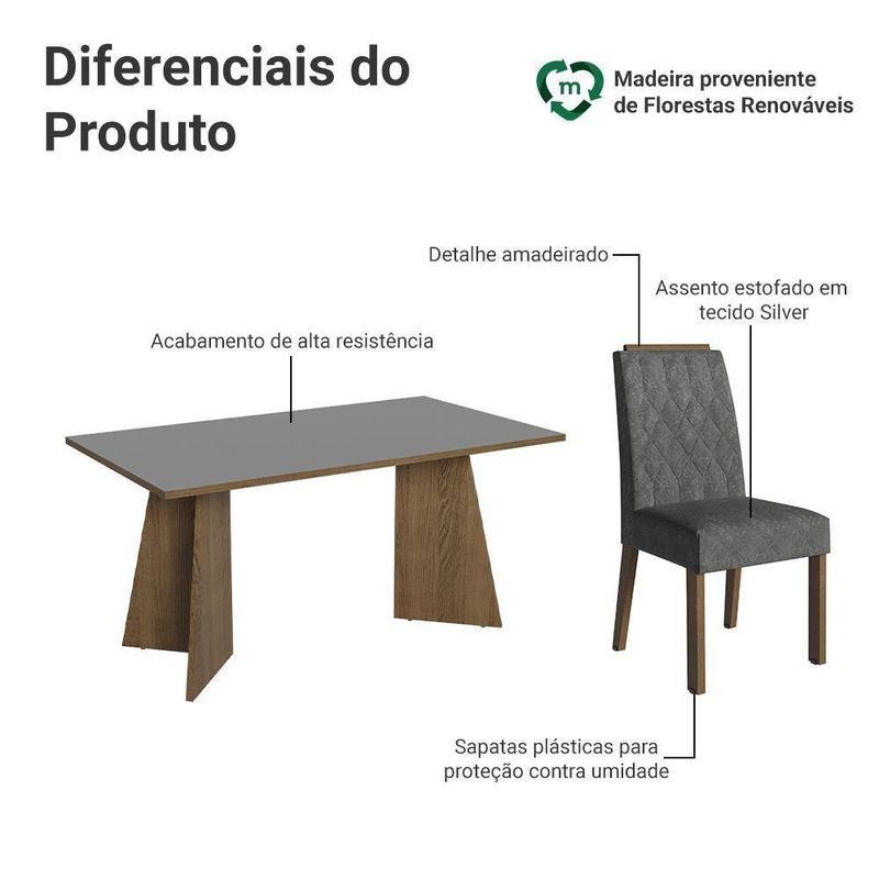 Conjunto Sala De Jantar Tampo De Madeira 4 Cadeiras Rustic/cinza/silver Tulum Madesa Rustic/cinza/silverA Sala de Jantar Tulum da Madesa foi projetada para transformar seus momentos à mesa em experiências únicas. Com um design contemporâneo, o conjunto une elegância e praticidade, proporcionando um ambiente mais acolhedor.A mesa com tampo em MDP, proporciona uma superfície robusta e resistente. Sua estrutura possui o design da base em formato trapézio, trazendo um visual moderno para a sua sala de jantar. O diferencial está no detalhe amadeirado no topo das cadeiras, que valoriza o design, e proporciona durabilidade do móvel.O acabamento da base da mesa é em tom amadeirado Rustic e do tampo em cinza, trazendo um toque moderno. As cadeiras são revestidas em tecido Suede Silver, completam o conjunto com sua textura suave, oferecendo um conforto adicional durante as refeições. Esse conjunto é a escolha ideal para quem busca aliar beleza, conforto e praticidade em um único espaço.Medidas da Mesa:- 78 cm de altura- 160 cm de largura- 90 cm de profundidadeMedidas de cada Cadeira:- 96 cm de altura- 45 cm de largura- 57 cm de profundidadeO que você recebe:- Uma Mesa com base em formato trapézio e tampo de MDP- Quatro Cadeiras Estofadas com Detalhe AmadeiradoCódigo do produto: MDJA040209F9SLÉ importante saber:- Material: MDP- Imagens meramente ilustrativas, a decoração não acompanha o produto- A Madesa não disponibiliza de montagem- O produto segue com manual de instalação e todas as ferragens necessárias para sua montagemA Madesa se dedica à sustentabilidade com várias iniciativas: temos uma usina própria que gera energia para uma das fábricas. Priorizamos fornecedores responsáveis com o meio ambiente. Todo o plástico utilizado na produção é reciclado, e as sobras também são reaproveitadas. Investimos no desenvolvimento de nossos colaboradores e em ações que beneficiem a comunidade.COR: Marrom | Garantia: 3 meses contra de fabricação | Dimensões - Altura: 78 cm | Dimensões - Largura: 160 cm | Dimensões - Profundidade: 90 cm | Peso aproximado: 73 kg | Produto: Conjunto Sala de Jantar | Quantidade de Lugares: 4 | RBN: Casa/Móveis/Móveis para Sala de Jantar/Conjuntos para Sala de Jantar | Material: MDP/MDF | Material para Filtro: MDP/MDF | Estado de Origem: RS | Conteúdo da embalagem: Uma Conjunto Sala de Jantar | Instruções/Cuidados: Utilize um pano limpo, levemente umedecido e seque em seguida a superfície. Não usar produtos químicos ou abrasivos para a limpeza. Recomendamos polir seu móvel com lustra-móveis duas a três vezes por ano. | Nome do Simples no Fornecedor: Conjunto Sala de Jantar Tampo de Madeira 4 Cadeiras Rustic/Cinza/Silver Tulum Madesa | Produto precisa de Montagem?: Sim | Descrição do Tamanho: 78 cm x 160 cm x 90 cm | Comprimento Produto Com Embalagem (cm): 165,80 | Largura Produto Com Embalagem (cm): 96,30 | Altura do Produto com Embalagem (cm): 86,10 | Peso Produto Com Embalagem (Kg): 73,18 | Fabricante: Madesa | Formato da Mesa: Retangular | Quantidade de caixas de embalagem: 5 | Cômodo Indicado: Sala de Jantar | Bullet Point 0: Dimensões: 78 cm altura x 160 cm largura x 90 cm profundidade | Bullet Point 1: O Conjunto Sala de Jantar da Madesa é a escolha perfeita para quem deseja transformar sua sala de jantar ou cozinha | Bullet Point 2: O grande diferencial está no detalhe amadeirado no topo da cadeira, que adiciona um toque sofisticado e facilita o manuseio, tornando-a prática para o dia a dia. | Bullet Point 3: Possui acabamento de alta resistência, conservando a beleza do móvel por muito mais tempo | É Frágil: Não | Quantidade de Itens: 1 | Certificação de teste externa: Sim | do modelo (model_number): MDJA040209F9SL | da peça: MDJA040209F9SL | Quantidade de Cadeiras: 4 | Componetes Incluidos: Guia de Montagem | is_assembly_required: Sim | Inclui manual de montagem (INCLUDES_ASSEMBLY_MANUAL): Sim | Requer montagem (REQUIRES_ASSEMBLY): Sim | Dimensões do item P x L x A (item_depth_width_height): depth#value=90;depth#unit=centimeters;height#value=78;height#unit=centimeters;width#value=160;width#unit=centimeters | Inclui manual de montagem: Sim | Precisa de baterias ou pilhas: Não | Dimensões do artigo (item_dimensions): depth#value=90;depth#unit=centimeters;height#value=78;height#unit=centimeters;width#value=160;width#unit=centimeters | manufacturer: | Peso do item (item_weight): ;unit=kilograms | Cor: Rustic/Cinza/Silver