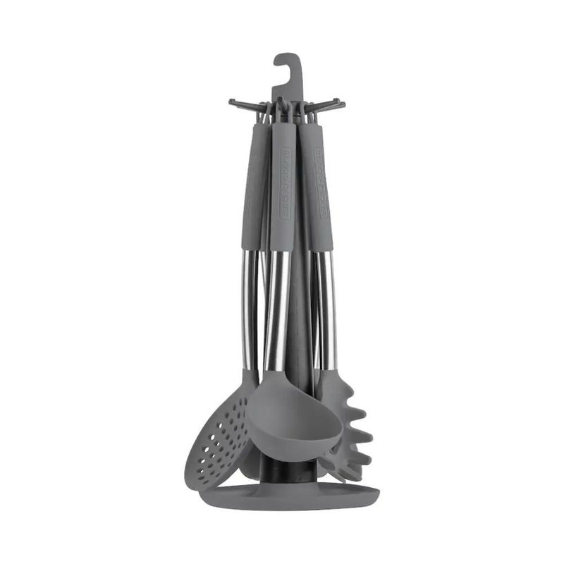 CONJUNTO DE UTENSÍLIOS DE COZINHA BLACK+DECKER LUMIERE 7 PEÇAS EM NYLON COM SUPORTEO Conjunto de Utensílios de Cozinha Black+Decker Lumiere é a solução ideal para o preparo de alimentos, combinando funcionalidade e organização. Com 7 peças essenciais e um suporte prático, este conjunto otimiza sua experiência culinária diária.Desenvolvido para a culinária doméstica, este conjunto versátil da Black+Decker possui peças em nylon de alta qualidade, garantindo durabilidade e resistência ao calor, além de proteger suas panelas antiaderentes. Os cabos revestidos em silicone proporcionam manuseio seguro, confortável e ergonômico. O suporte incluso mantém os utensílios organizados e ao alcance, otimizando o espaço no balcão. A linha Lumiere destaca-se pelo design moderno e funcionalidade para o dia a dia na cozinha, facilitando diversas tarefas no preparo de suas receitas.Ficha TécnicaMarca: Black&DeckerMaterial: Nylon, SiliconeTipo de Produto: Conjunto de Utensílios de CozinhaEAN: 7908709500995Código de Referência: BXUTHCTSET02