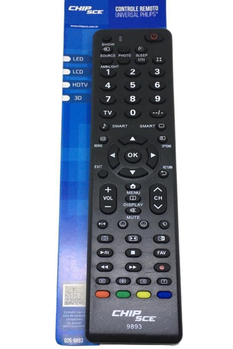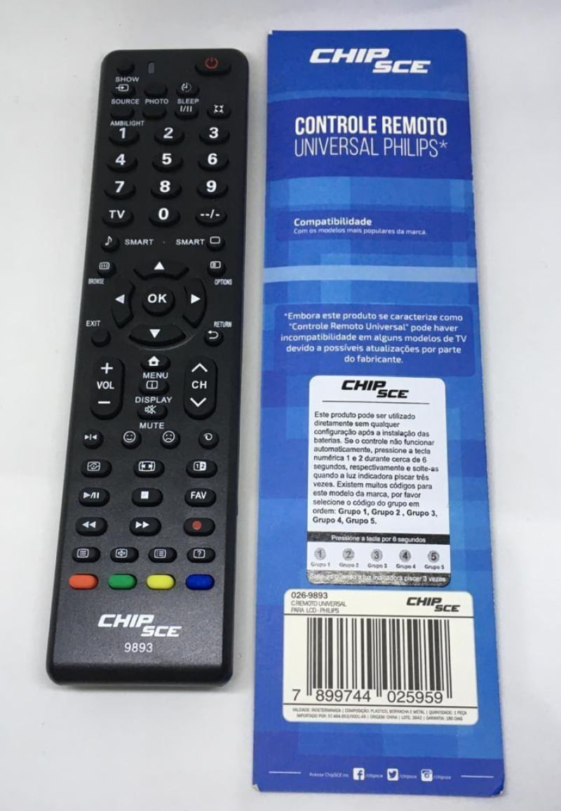 Qualidade em Componentes Eletrônicos e peças de reposição. Controle remoto universal fácil Não precisa de configuraçãoÉ só colocar as pilhas e usar. Compatível com os modelos mais populares da marca.Especificações:Embora este produto se caracterize como "Controle Remoto Universal" pode haver incompatibilidade em alguns modelos de TV devido a possíveis atualizações por parteDo fabricante.DESCRIÇÃO:- Controle Remoto Universal para LCD Philips- Marca: Chip Sce- Referência: 026-9893- Compatível com os modelos mais populares da marca.